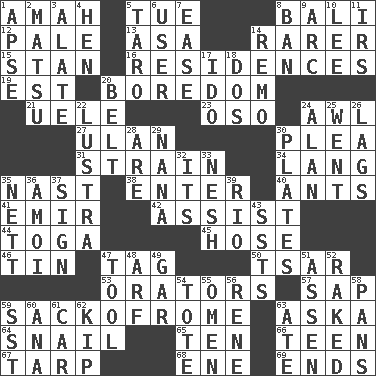 ACROSS 1. Housemaid 5. Third day of the wk. 8. Indonesian resort city 12. Light colored 13. White ___ sheet 14. More valued for its uncommonness 15. Comedian Laurel of Laurel & Hardy 16. Dwellings 19. Eastern Standard Time (abbr.) 20. Mood resulting from idleness 21. Ubangi River tributary 23. Bear (Spanish) 24. Leather borer 27. ____ Bator, Mongolia 30. Entreaty 31. Put through a sieve 34. Austrian-born American filmmaker Fritz 35. Political cartoonist Thomas 38. Keyboard key 40. Pismires 41. Independent ruler or chieftain 42. Aid 44. Ancient Roman robe 45. Stockings 46. Shallow baking pan 47. Label 50. Russian ruler of old 53. Speakers 57. Plant excrement 59. Italian handbag shop? 63. "____ silly question..." 64. Slow-paced one 65. "___ Little Indians" 66. Adolescent 67. Canvas cover 68. Compass dir. 69. Extremities DOWN 1. Domed church section 2. Taiwanese island in East China Sea 3. Having winglike extensions 4. Layer 5. Pacific island yam 6. One who uses or employs something 7. Comfort 8. Bar 9. Curve 10. Area sheltered from the wind 11. Big collection agency 14. San ____ (Riviera town) 17. Wedding promise 18. Two (Sp.) 20. Waist strap 22. A period of five years 24. Actor Alda or Thicke 25. Gone 26. Falls behind 28. "We ___ not amused" (Victoria) 29. Grandmother 30. Food holders 32. It is 33. Tender 35. Remaining after all deductions 36. Mine, in Marseilles 37. Omen 39. River (Sp.) 43. Fast planes 47. Implement 48. Sandy's bark 49. Slender fish 51. NE Netherlands city 52. Swept the length of 54. Carryall 55. Sign of things to come 56. French philosopher Descartes 58. Zero-star reviews 59. Fast jet (abbr.) 60. Santa ___, CA 61. Auto 62. Sleep 63. Had dinner