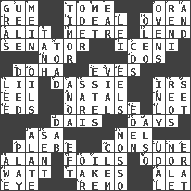 ACROSS 1. Chewing product 4. Heavy book 8. Mouth or opening 11. To separate or throw off 12. Standard of perfection 14. Baking chamber 15. Set down 17. Distance measurement (Brit.) 18. Grant temporary use of 19. Legislator 21. Ancient Celtic tribe of eastern Britain 23. And not 24. Two (Sp.) 25. Capital of the state of Qatar 27. Nights before holidays 30. Cards in a Roman deck? 31. Hyrax 34. Big collection agency 37. Snakelike fish 38. Brizilian seaport 39. Born 40. Begley and Asner 41. Threatening words 43. Car dealer's back yard 44. Raised platform 45. 24-hour periods 47. White ___ sheet 49. Cartoonist voice _ Blanc 50. Military trainee 52. Eat 56. Actor Alda or Thicke 57. Fencing necessities 60. Aroma 61. Electrical Unit 62. Receives possession of 63. According to 64. Sight organ 65. San ____ (Riviera town) 66. Allow DOWN 1. Pate de foie ____ 2. Ubangi River tributary 3. Count _ (2 wds.) 4. The easternmost of the Lesser Sundas 5. River in Europe 6. Was introduced to 7. Ewer handle 8. Baking chambers 9. Painter Guido (1575-1642) 10. Plus 13. Luau accessory 14. Margarine 16. Hyperbolic tangent 20. Frog relative 22. Music discs 25. Passed on 26. Lubricates 27. _____ Park, CO 28. Small bottle 29. Snakelike fish 30. Area sheltered from the wind 32. Small Philippine buffalo 33. Indian skirt 34. In an inward manner 35. Vintage cars 36. Put into a specified state 42. Paradise 44. Pat or tap gently 46. In addition 47. Having winglike extensions 48. Emitted 49. With motion or animation 50. Frolic 51. Bank Draft (abbr.) 52. Clement's nick name 53. Freehold land 54. Undercover agent 55. Part of Q.E.F. 56. Deep reverence 58. Rowing implement 59. Mamie's husband