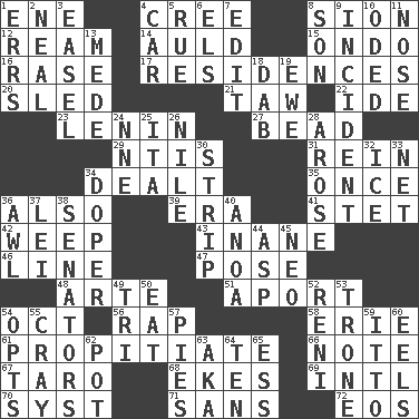 ACROSS 1. Compass dir. 4. Algonquian 8. The Jewish people; Israel 12. 480, 500 or 516 sheets of paper 14. Old (Scot.) 15. Southwest Nigerian state 16. To erase 17. Dwellings 20. Downhill vehicle 21. The 23rd letter of the Hebrew alphabet 22. Binary compound 23. Soviet premier 1918-24 27. Necklace unit 29. Nuclear Threat Initiatives 31. It's straight from the horse's mouth 34. Started a card game 35. Single time 36. In addition 39. Period 41. Proofreading order 42. Shed a tear 43. Lacking in sense or substance 46. Actor's bit 47. Introduce or present, as a question 48. Johnson of "Laugh-In" 51. To the left, to Queeg 54. Sep. follower 56. Reproach for some lapse or misdeed 58. One of the Great Lakes 61. Appease 66. Make mention of 67. Pacific island yam 68. Supplements with great effort 69. International (abbr.) 70. System (abbr.) 71. Without 72. Greek goddess of the dawn DOWN 1. Blunders 2. Actress Patricia 3. Artist's stand 4. 4-wheeled motor vehicle 5. Regret 6. Raised railways 7. Prepare for publication 8. Boy, to dad 9. Happening 10. Wrote a lyric poem 11. Characteristic smell of wine 13. Ancient Persian 18. Small moist lump or mass 19. She-sheep 24. Compass dir. 25. Call ___ day 26. The longest river in the world 28. Came up 30. Long narrow piece of something 32. Frozen water 33. Fish or hair follower 34. Drug addict 36. Leather borer 37. Flowery wreath 38. Elected representatives 40. Small Philippine buffalo 44. Cleo's killer 45. Modern: prefix 49. Three (prefix) 50. Consume 52. Painter Guido (1575-1642) 53. Marketplace scale 54. Chooses 55. Supercomputer manufacturer 57. Sliced desserts 59. "Tell ____ the Marines!" 60. Snakelike fish 62. Cooking vessel 63. Alias (abbr.) 64. "___ Little Indians" 65. Double-curved letter