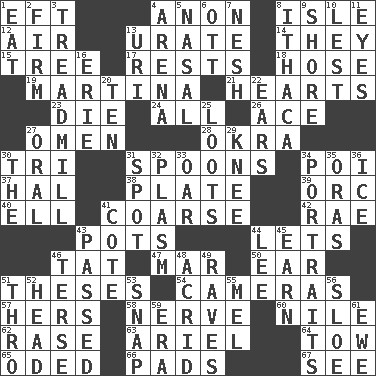 ACROSS 1. Bank Draft (abbr.) 4. Soon (poet.) 8. Capri or Wright 12. Atmosphere 13. A salt of uric acid 14. Those things 15. Woody plant 17. Musical pauses 18. Flexible conduit 19. Chrissie's court nemesis 21. Centers of feelings and intuitions 23. Pass on 24. 100% 26. Adept person 27. Sign of something about to happen 28. Gumbo ingredient 30. Three (prefix) 31. Soup utensils 34. Luau course 37. Actor Linden 38. Food holder 39. The grampus (Milton) 40. Pipe bend 41. Rough 42. Actress Charlotte 43. Plant holders 44. Allows 46. Make lace 47. Spoil 50. Hearing organ 51. College papers 54. Devices for capturing images 57. Possessive pronoun 58. Impudent aggressiveness 60. The longest river in the world 62. To erase 63. Satellite of Uranus 64. Pull behind 65. Wrote a lyric poem 66. Writing tablets 67. Perceive with the eye DOWN 1. Ingest 2. Become taut 3. Excercise machine 4. Sports stadium 5. Rhinal 6. Baseball player Mel 7. Tender 8. New York city 9. Dinah or Pauly 10. For fear that 11. Sight organs 13. RI univ. 16. One of the Great Lakes 20. "___ Little Indians" 22. Hearing organs 25. Plunders 27. Relating to the mouth 29. Leg joint 30. Definite Article 31. Blemish 32. Suffix with ecto or cyto 33. Rowing implement 34. Likenesses of persons 35. Mouths or openings 36. Frozen water 41. ____ d'Azur (French Riviera) 43. Went by 44. Area sheltered from the wind 45. Merit 46. Laconic 48. Bitter 49. All-night dance parties 51. Through, poetically 52. Froth on beer 53. Fastener 55. Cartoonist voice _ Blanc 56. A type of plum 59. Epoch 61. She-sheep