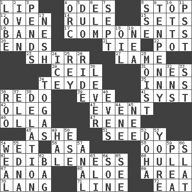 ACROSS 1. Mouth edge 4. Lyric poems 8. Cease 12. Baking chamber 14. Governing power 15. Puts into a specified state 16. Object of repulsion 17. Parts 20. Conclusions 21. Standoff 22. Cooking vessel 23. Bake eggs in their shells 27. Unable to walk 29. To provide with a ceiling 31. Singles 34. Miss Universe 1986, Barbara Palacios _ 35. Lodging establishments 36. Redecorate 39. Night before a holiday 41. System (abbr.) 42. Cassini of fashion 43. Happening 46. Water jar 47. French philosopher Descartes 48. American tennis player Robert 51. Full of seeds 54. Dripping 56. White ___ sheet 58. I made a mistake 61. The property of being fit to eat 66. Frame or body of a ship 67. Small Philippine buffalo 68. Medicinal plant 69. Type of rug 70. Long (Scottish) 71. Actor's bit 72. Ingest DOWN 1. Ear part 2. _ the terrible 3. Depends 4. The grampus (Milton) 5. Superhero pair 6. Shade tree 7. Back-to-school mo. 8. Compass dir. 9. 3-inch nail 10. Von Bismarck 11. Inconspicuous attention getter 13. Soft 18. Lubricate 19. Teachers' org. 24. Frozen water 25. Marina Del _, California 26. Travel on an animal 28. Wet 30. Prying instrument 32. Followers of ems 33. Fast jet (abbr.) 34. Ancient Roman robes 36. Friend of Pooh 37. Pipe bend 38. Conveyance 40. Nights before holidays 44. Compass dir. 45. Born 49. Actor Linden 50. Compass dir. 52. Capital of the state of Qatar 53. You are 54. Welt 55. Pulitzer Prize-winning author Ferber 57. Of or related to the anus 59. Entreaty 60. Narrow board 62. Paper or plastic container 63. Biblical high priest 64. Boy, to dad 65. Perceive with the eye