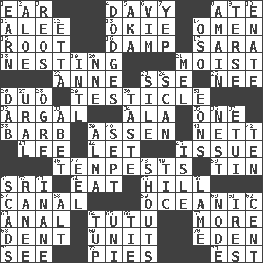ACROSS 1. Hearing organ 4. _ Jones??? Locker 8. Had dinner 11. Toward shelter 13. Migrant worker of the '30s 14. Sign of something about to happen 15. Carrot, for example 16. Moist 17. "Two Mules for Sister ____" 18. Snuggling 21. Wet 22. Queen of England 1702-14 23. Compass dir. 25. Born 26. Superhero pair 29. One of the two male reproductive glands 32. Therefore, facetiously 34. Insect wing 35. Single 38. Sharp remark 39. NE Netherlands city 41. Remaining after all deductions 43. Area sheltered from the wind 44. Allow 45. Come out of 46. Storms 50. Metal container 51. _ Lanka 54. Ingest 55. Land elevation 57. Lessep's creation 59. Pertaining to the sea 63. Of or related to the anus 64. Ballerina skirt 67. Greater amount 68. Scratch 69. A single undivided whole 70. Genesis locale 71. Perceive with the eye 72. Sliced desserts 73. Eastern Standard Time (abbr.) DOWN 1. Merit 2. _ vera 3. Vintage cars 4. Evades 5. Alias (abbr.) 6. Zeal 7. Slangy assent 8. At full speed 9. Laconic 10. Related on the mother's side 12. Singer James 14. Bear (Spanish) 19. International (abbr.) 20. Compass dir. 21. Cartoonist voice _ Blanc 23. Drop; flow; fall 24. Examine hastily 26. Apply (a substance) by light strokes 27. Mountain range 28. Legendary monster 30. Clothes sense 31. Immeasurably long periods of time 33. Collude with 36. A home for chicks 37. Needle holder 39. _ mater 40. Back-to-school mo. 42. Nine, plus one 45. Small island 47. Snakelike fish 48. Yells 49. Nervous spasm 51. Heaps 52. The wife of a rajah (variant) 53. Empty; void 56. Unable to walk 58. The first octave above the treble staff 60. Connecting point 61. Angers 62. Penny 64. Uncastrated adult male sheep 65. Corn or form start 66. Standoff