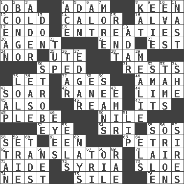ACROSS 1. Chief or king in Benin or Nigeria 4. First of billions? 8. Peachy ____! 12. Chilled 14. Bodily heat indicating an inflammation 16. Inventor's middle name 17. Inside; within (prefix) 18. Pleas 20. Representative 22. Conclude 23. Eastern Standard Time (abbr.) 24. And not 25. Shoshoni 28. Scottish cap 30. Drove too fast 31. Musical pauses 35. Allow 37. Eons 40. Wet nurse 41. Fly high 42. Indian princess (variant) 44. Welles in "The Third Man" 45. In addition 46. 480, 500 or 516 sheets of paper 47. ___ a Wonderful Life 48. First-year military academy student 50. The longest river in the world 52. Sight organ 54. _ Lanka 55. Distress signal 58. Put into a specified state 61. Car or cant ending 63. _ dish (used to culture cells) 65. Interpreter 70. Den 71. Helper 72. Damascus' land 73. A type of plum 74. Egg locale 75. Filth; sediment 76. Followers of ems DOWN 1. Sea 2. Beat drum 3. Tree or shrub in the Birch family 4. Adept person 5. One of the 12 tribes of Israel 6. Keyboard modifier key 7. Greater amount 8. Krazy ___ of comics 9. Writer Wiesel 10. Nights before holidays 11. Political cartoonist Thomas 13. Spanish title 15. Monthly bill 19. The sixth month of the Jewish calendar 21. Uncastrated adult male sheep 26. Rend 27. _ Allan Poe 29. Ear of corn 30. Disco prop 32. Stricken, poetically 33. Scottish caps 34. A female animal or person 35. Hang loosely or laxly 36. Relaxation 38. Compass dir. 39. Actors Connery and Penn 41. Plant excrement 43. Independent ruler or chieftain 49. Sight organs 51. Mouth edge 53. Snakelike fish 55. Having lost freshness 56. Constellation of myth 57. Male parents of animals 58. Comedian Laurel of Laurel & Hardy 59. 4th largest of the Great Lakes 60. Bits 62. Negative votes 64. Raised railways 66. Fish or hair follower 67. Three (prefix) 68. Petroleum 69. Actress Charlotte