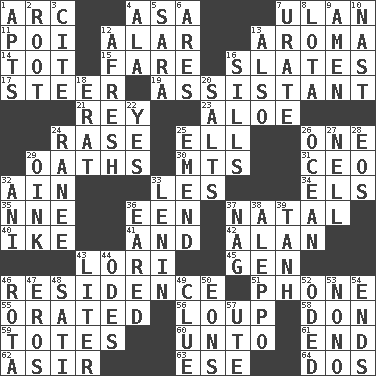 ACROSS 1. Curve 4. White ___ sheet 7. ____ Bator, Mongolia 11. Luau course 12. Having or resembling wings 13. Odor 14. Small child 15. Conductor's collection 16. Chalkboards 17. Bull 19. Helper 21. Marina Del _, California 23. _ vera 24. To erase 25. Pipe bend 26. Single 29. Profane or obscene expressions 30. Mountains (abbr.) 31. Corporate head (abbr.) 32. The 18th letter of the Arabic alphabet 33. French article 34. Raised railways 35. Compass dir. 36. Car or cant ending 37. Brizilian seaport 40. Mamie's mate 41. Plus 42. ____ Jay Lerner 43. Australian parrot (variant) 45. Commissioned mil. rank 46. Home 51. Give a jingle 55. Spoke pompously 56. Central Nebraska county 58. Spanish title 59. Lugs 60. To (old English) 61. Conclusion 62. SW Saudi Arabia district 63. Compass dir. 64. Two (Sp.) DOWN 1. Flats, for short 2. Carrot, for example 3. Quote 4. Chicken ___ king 5. "Two Mules for Sister ____" 6. Ancient Greek god of war 7. A salt of uric acid 8. Globular water bottle used in Asia 9. So be it 10. Political cartoonist Thomas 12. Anew 13. In addition 16. Beverly of Met fame 18. Part of Q.E.F. 20. Table seasonings 22. Affirmative reply 24. Indian princess (variant) 25. Make improvements or corrections to 26. Sea 27. 1994 drama film starring Jodie Foster 28. Greek goddess of the dawn 29. Pig sound 32. Black tropical American cuckoo 33. Soviet premier 1918-24 36. Having ears or earlike features 37. Tired old horse 38. City in Syria 39. Hyperbolic tangent 43. 61 cubic inches 44. Lyric poems 46. Round or rotation of duties 47. Greek god of love 48. Suttee (variant) 49. A slight indication 50. Immeasurably long periods of time 52. Wrote a lyric poem 53. Words to Nanette 54. Conclusions 57. Shoshoni