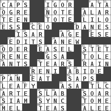 ACROSS 1. Balmoral and tarboosh 5. Russian composer Stravinsky 9. _ moment's notice (2 wds.) 12. Legendary monster 13. Make mention of 14. Having or resembling wings 15. Adolescent 16. Carry 17. _ and Stitch 18. Double-curved letter 19. Corporate head (abbr.) 21. Natives or inhabitants of Denmark 22. Astrian river, tributary to the Danube 24. Personal question 26. Compass dir. 27. Proofreads 28. Afresh 29. Baltic tributary 30. Artist's stand 32. Proofreading order 36. French philosopher Descartes 37. Girls' org. (abbr.) 38. Lacquered or enameled metalware 39. Pismires 40. Separates forcefully 42. Water falling in drops from the sky 43. Painter Guido (1575-1642) 44. Remain 46. Baking dish 49. Ingest 50. Plant excrements 51. Like summer trees 53. White ___ sheet 54. Affectionate concern, for short 57. Johnson of "Laugh-In" 58. Thick slice 61. Fly high 62. Thailand, formerly 63. Synchronize (abbr.) 64. Heavy book 65. Cartoonist voice _ Blanc 66. Beverages made from leaves 67. Toward shelter DOWN 1. ____ d'Azur (French Riviera) 2. Matures 3. Elected leader of a country 4. Elected rep. 5. To the inside or interior of 6. Thick or sticky substance 7. Baseball player Mel 8. To sift 9. Place in a line 10. Lies 11. Came up 14. According to 19. Domesticated feline 20. Celtic language 21. Morning condensation 23. Begets 24. Approach 25. Set 27. Genesis locale 28. Slender Brazilian palm 29. Mouth or opening 31. Rep 32. Remove all contents or possession from 33. Inedible or poisonous agaric 34. Writer Wiesel 35. "___ Little Indians" 40. Beverage made from leaves 41. Backtalk 43. Marina Del _, California 45. Sound made by sheep 46. Suffix with ecto or cyto 47. Nest on high 48. Brizilian seaport 52. Opposite of masc. 53. Lettered men learn these first 55. Unable to walk 56. Algonquian 58. Fast jet (abbr.) 59. Sodium hydroxide 60. Santa ___, CA 61. R.R. building