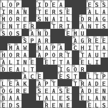 ACROSS 1. Chop off 4. It may be bright or harebrained 8. Curvy letter 11. SW Asia republic 13. Laconic 15. Chicken ___ king 16. Greater amount 17. Slow-paced one 18. To draw with force 19. Keyboard key 21. Three (prefix) 22. Pismires 23. Distress signal 24. Added to 27. Australian flightless bird 29. Practice fight 30. Match 34. Opening into something insatiable 36. California wine valley 39. Riviera of "Kiss of the Spider Woman" 40. Israeli folk dance 41. To the left, to Queeg 43. Strained 44. Place in a line 46. Singer James 47. Biblical high priest 48. Started a card game 49. Composer Stravinsky 51. Adept person 53. Eastern Standard Time (abbr.) 54. Mouth edge 57. Path through which fluid escapes 60. Fitting 63. Swap 65. Legendary monster 66. Gospel singer Marvin 69. An important port of Yemen 70. Sound made by sheep 71. Stories 72. Enthusiasm 73. Begley and Asner 74. French philosopher Descartes 75. Raised railways DOWN 1. Citrus fruits 2. U. of Maine site 3. Pieces 4. ___ a Wonderful Life 5. Lair 6. Part of Q.E.F. 7. SW Saudi Arabia district 8. Merit 9. Narrow board 10. Settles 12. Born 14. Writer Wiesel 18. Female offspring 20. Strike 25. Grandmother 26. Window treatment 28. Apple computer (short form) 29. Tchaikovsky ballet 31. Monetary unit of Yemen 32. Needle holder 33. Consume 34. Undercover agent 35. Roberta Peters solo 37. Plant holder 38. Nick name for Arthur 40. Possessed 42. Labels 45. And so on (abbr.) 50. Baseball player Mel 52. 90 degrees 54. Dipping utensil 55. Perfect 56. Actor Sean's family 57. Ear part 58. Mild oath 59. Ancient river in northeast Turkey 61. Lightbulb-shaped fruit 62. Story 64. Actress Charlotte 67. Elected rep. 68. Compass dir.