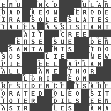 ACROSS 1. Australian flightless bird 4. Non-commissioned officer (abbr.) 7. ____ Bator 11. June honoree 12. Period of immesurable duration 13. Eat (away) 14. Lyricist Gershwin 15. Not divided or shared with others 16. Chalkboards 17. Stories 19. Aide 21. Small island 23. Algonquian 24. Celtic language 25. Institute legal proceedings 26. Lair 29. Before Barbara or Clara 30. Mountains (abbr.) 31. Wedding promise 32. Mayday 33. Falsehood 34. ___ Haven, CT 35. Sliced dessert 36. Snakelike fish 37. Bee-related 40. Everything 41. A saturated hydrocarbon 42. Son of Odin 43. Australian parrot (variant) 45. A really long time 46. Dwelling 51. Sadhe (variant) 55. Spoke pompously 56. Margarine 58. Be seated 59. Carrier 60. Petroleums 61. Car or cant ending 62. SW Saudi Arabia district 63. French article 64. Nursemaid (var.) DOWN 1. Prepare for publication 2. Hindu Mythology: god of death 3. Allodial 4. Modern: prefix 5. Root beer relative 6. Washington bills 7. A salt of uric acid 8. Globular water bottle used in Asia 9. An important port of Yemen 10. Egg locale 12. Aid 13. Otherwise 16. Male parents of animals 18. Merit 20. Turtle shell scale 22. Afternoon social gathering 24. Artist's stand 25. Grin 26. Middle Eastern gold or silver currency 27. Paradise 28. At this time 29. Land 32. Health resort 33. Soviet premier 1918-24 36. Having ears or earlike features 37. Had dinner 38. Pictures 39. Charged atoms 43. 61 cubic inches 44. River in Europe 46. Roll call or roster of names 47. Greek god of love 48. Suttee (variant) 49. Calm and collected 50. Writer Wiesel 52. At sea 53. South Vietnam president (1954) 54. Inactive volcano in Sicily 57. Raised railways