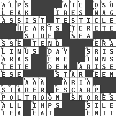 ACROSS 1. High mountains 5. Had dinner 8. Bear (Spanish) 11. Path through which fluid escapes 12. Angers 13. Tired old horse 14. Help 17. A testis 19. Centers of feelings and intuitions 21. Cylindrical with tapered ends 22. Turn sharply 23. Ocean 24. Compass dir. 27. Watch over 29. Period 32. "_ and Lucy" (Charlie Brown theme song) 34. 24 hours 36. Indian titles of respect 37. Caspian sea tributary 38. Compass dir. 39. Restaurants 40. False hair 41. Lair 42. Ascend 43. Compass dir. 44. Play the lead 46. Car or cant ending 47. American Automobile Association (abbr.) 50. Operatic vocal solo 52. A viewer who gazes fixedly 55. Fortification 57. Characterized by complete cowardliness 59. Sounds asleep 62. 100% 63. Naughty children 64. Drop; flow; fall 65. Afternoon social gathering 66. Consume 67. Give off DOWN 1. Insect wing 2. French article 3. Romantic infatuation 4. Atmospheres 5. "We ___ not amused" (Victoria) 6. Trials 7. First name in cosmetics 8. At one time in the past 9. Table seasoning 10. Double curve, resembling the letter S 12. It is 15. Table seasonings 16. Loyal 18. Retirement account (abbr.) 20. Looked after 24. Schedule 25. Fathers 26. Maternal 28. Natives or inhabitants of Denmark 29. Bert's buddy 30. Remove soap 31. NE Netherlands city 33. Purpose 35. Gossips 36. Title for a knight 42. Believer in; advocate of (suffix) 45. Arches 47. Nonscientific branch of learning 48. Nest on high 49. Scent 51. Came up 52. Argument over a trivial matter 53. Lacquered or enameled metalware 54. Silent film actress Nazimova 55. Followers of ems 56. Demure 58. Elect 60. Connecticut Ivy Leaguer 61. Arrange properly for use