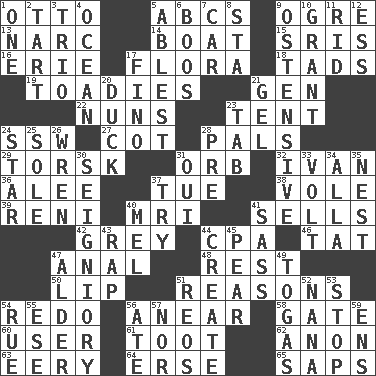 ACROSS 1. Von Bismarck 5. Lettered men learn these first 9. Legendary monster 13. Drug cop 14. Water vessel 15. Indian titles of respect 16. 4th largest of the Great Lakes 17. Plants 18. Bits 19. Sycophants 21. Commissioned military rank (abbr.) 22. Religious women 23. Portable shelter 24. Compass dir. 27. Small bed 28. Friends 29. Cod relative 31. Globe 32. "Terrible" tsar 36. Toward shelter 37. Third day of the wk. 38. Short-tailed, large-bodied rat 39. Painter Guido (1575-1642) 40. Medical imaging device (abbr.) 41. Makes a sale 42. Jennifer or Joel 44. Tax preparer (abbr.) 46. Make lace 47. Of or related to the anus 48. Take ten 50. Mouth edge 51. Thinks logically 54. Make new 56. Approach 58. Yard entry 60. One who uses or employs something 61. A blast of a horn 62. Soon (poet.) 63. Suggestive of the supernatural 64. Celtic language 65. Plant excrements DOWN 1. Single 2. Small pie 3. Musical group of three 4. Sea 5. Most capable 6. Scornful sounds 7. Auto 8. R.R. building 9. Clearly or manifestly demonstrative 10. Monetary aid 11. To free from 12. Double-curved letter 17. A pale, very dry sherry 20. Evade 21. Set 23. Keyboard key 24. Play the lead 25. Flatfish 26. Songbird 28. Before (prefix) 30. Signiory (variant) 31. Fr. "Yes" 33. Electrical Unit 34. Silent film actress Nazimova 35. A home for chicks 37. Attempt to accomplish something 40. Cartoonist voice _ Blanc 41. Backtalk 43. Strike 44. Make 45. Lightbulb-shaped fruit 47. Tree or shrub in the Birch family 49. Ancient Roman robes 51. Vintage cars 52. Grandmother 53. Halt 54. Regret 55. Compass dir. 56. Had dinner 57. Or not 59. Followers of ems