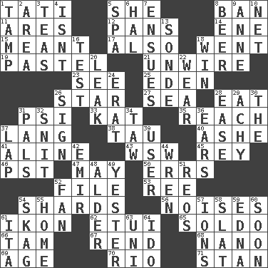 ACROSS 1. Jacques of French films 5. A female animal or person 8. Bar 11. Ancient Greek god of war 12. Baking dishes 14. Compass dir. 15. Intended 17. In addition 18. Left 19. Soft color 21. Undo the wiring of 23. Observe 25. Locale of original sin 26. Play the lead 27. Ocean 28. Erode 31. 23rd letter of the Greek alphabet 33. Krazy ___ of comics 35. Arrive at 37. Austrian-born American filmmaker Fritz 38. The 19th letter of the Greek alphabet 40. American tennis player Robert 41. Place in a line 43. Compass dir. 45. Marina Del _, California 46. Pacific Standard Time (abbr.) 47. Fifth month 50. Blunders 52. Do some clerical work 53. To separate or throw off 54. Pottery fragments 56. Annoying sounds 61. Picture 62. Needle holder 65. Twentieth part of a lira 66. Scottish cap 67. Tear apart 68. Billionth: prefix 69. Personal question 70. River (Sp.) 71. Comedian Laurel of Laurel & Hardy DOWN 1. Pack (down) 2. Length times width 3. Afternoon social gatherings 4. Is not 5. Health resort 6. Actor Linden 7. Takes place subsequently 8. Fermented drink made from hops 9. Queen of England 1702-14 10. Fish or hair follower 13. Something which is sent 16. Trial 18. Acquire through effort 20. Path through which fluid escapes 22. Put on (as clothing) 24. Part of Q.E.F. 26. Signal 28. Relaxation 29. Painful 30. Definite Article 31. Friends 32. In a ____ (agitated or irritated) 34. The 23rd letter of the Hebrew alphabet 36. Hearing organs 37. Pet locale 39. One who uses or employs something 42. Arab leader 44. Songbird 48. Tree or shrub in the Birch family 49. Next before 51. Vintage cars 52. Avid follower 54. Heroin 55. Residence 57. Charged atoms 58. Narrow board 59. Pulitzer Prize-winning author Ferber 60. Within a short period 61. Call ___ day 63. Single; one (prefix) 64. Wedding promise