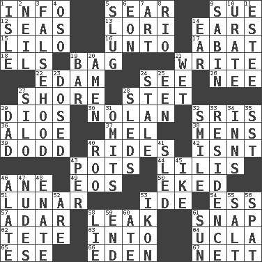 ACROSS 1. A message received and understood 5. Dry up 9. Institute legal proceedings 12. Oceans 13. Australian parrot (variant) 14. Hearing organs 15. _ and Stitch 16. To (old English) 17. Blind as ____ 18. Raised railways 19. Paper or plastic container 21. Compose 22. Dutch treat 24. Observe 26. Born 27. Dinah or Pauly 28. Proofreading order 29. "Vaya con ____" 30. Pitcher Ryan 32. Indian titles of respect 36. Medicinal plant 37. Cartoonist voice _ Blanc 38. Not women's 39. Texas town _ City 40. Amusement-park features 42. Is not 43. Plant holders 44. Ms. Damita and namesakes 46. A saturated hydrocarbon 49. Greek goddess of the dawn 50. Made supply last 51. Type of eclipse 53. Binary compound 54. Curvy letter 57. The sixth month of the Jewish calendar 58. Path through which fluid escapes 61. Fastener 62. Wig 63. To the inside or interior of 64. Southern CA. univ. 65. Compass dir. 66. Locale of original sin 67. Remaining after all deductions DOWN 1. Small island 2. Famous astronaut Armstrong 3. It jiggles the polygraph 4. Bear (Spanish) 5. Snaillike creature with no shell 6. Period of immesurable duration 7. Tate display 8. _ de Janeiro 9. Unit of acoustic absorption 10. A salt of uric acid 11. First name in cosmetics 14. Hearing organ 19. Drinking establishment 20. So be it 21. Soggy 23. Administered medicine 24. Showing deterioration from age 25. Car or cant ending 27. Grain storage tower 28. Bobsleighs 29. June honoree 31. Leaves out 32. Grin 33. Dwelling 34. Restaurants 35. Fast jet (abbr.) 40. Friend of Pooh 41. Downhill vehicle 43. For each 45. Eisenhower's nickname 46. Having winglike extensions 47. Unadorned figures 48. Maternal 52. "We ___ not amused" (Victoria) 53. Visual representation of an object 55. Table seasoning 56. Argument over a trivial matter 58. Whopper 59. Conclude 60. Had dinner 61. Player for Phoenix