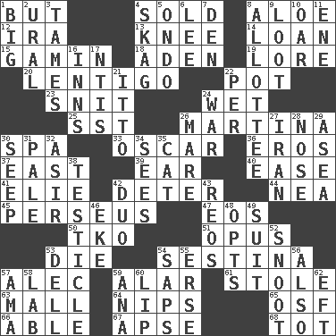 ACROSS 1. With the exception that 4. Exchanged or delivered for money 8. _ vera 12. Retirement account (abbr.) 13. Leg joint 14. Grant temporary use of 15. Street urchin 18. Arabian gulf 19. Old wives' tales, e.g. 20. Small, flat, pigmented spot on the skin 22. Cooking vessel 23. In a ____ (agitated or irritated) 24. Dripping 25. Fast jet (abbr.) 26. Chrissie's court nemesis 30. Health resort 33. Motion picture award 36. Greek god of love 37. 90 degrees 39. Ewer handle 40. Comfort 41. Writer Wiesel 42. Prevent from occurring 44. Teachers' org. 45. Son of Zeus who helped slay Medusa 47. Greek goddess of the dawn 50. Ring climax 51. Musical composition 53. Expire 54. French poetic form 57. Actor Baldwin 59. Having or resembling wings 61. Fur scarf 63. Promenade 64. Pinches, bites 65. Order of Saint Francis (abbr.) 66. Competent 67. Domed church section 68. Small child DOWN 1. Of large size 2. Mountain range 3. Domesticates 4. Heroin 5. Southwest Nigerian state 6. Area sheltered from the wind 7. Lair 8. One to whom something is allotted 9. Plunder 10. Boat paddle 11. Compass dir. 16. Taverns 17. Nuclear Threat Initiatives 21. "Tell ____ the Marines!" 22. For each 24. Armed conflict 26. Female horse 27. SW Asia republic 28. Sense of smell 29. At sea 30. Ooze 31. Diluted with white 32. SW Saudi Arabia district 34. Observes 35. Feline 38. One of the two male reproductive glands 42. Superhero pair 43. Vintage cars 46. Make supply last 48. Chooses 49. Set or collection 52. Snout, nose 53. Small valley 54. Plant excrements 55. Celtic language 56. In addition 57. Housemaid (var.) 58. Experiment locale 59. Santa ___, CA 60. Mouth edge 62. Bank Draft (abbr.)