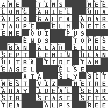 ACROSS 1. A saturated hydrocarbon 4. Canisters 8. Born 11. Having great length 13. Satellite of Uranus 15. Mouth or opening 16. In addition 17. An organ shaped like a helmet 18. The sixth month of the Jewish calendar 19. Grayish beige 21. Shade tree 22. Wagers 23. Compass dir. 24. Fr. "Yes" 27. Tenth month of the Hindu calendar 29. Extremities 30. Drinks excessively 34. Forbid 36. Having or resembling wings 39. Evade 40. Back-to-school mo. 41. Soviet premier 1918-24 43. ____ Bator 44. Extreme 46. Event that recurs at intervals 47. Scottish cap 48. Artist's stand 49. Otherwise 51. _ moment's notice (2 wds.) 53. Secret 54. Be seated 57. Egg locale 60. That is 63. Distance measurement (Brit.) 65. Like ___ of sunshine 66. Standard of perfection 69. Shrivel 70. Title for a knight 71. Gospel singer Marvin 72. Puts into a specified state 73. Afternoon social gathering 74. High mountains 75. To riddle DOWN 1. Having winglike extensions 2. Pitcher Ryan 3. Follow as a consequence or result 4. Label 5. Retirement account (abbr.) 6. "Death on the ____" 7. Sew up the eyelids of hawks and falcons 8. Thickened enlargement 9. Part of Q.E.F. 10. Hearing organs 12. Grand Old Party 14. Desk light 18. Utter; complete 20. Period of immesurable duration 25. Allodial 26. Small island 28. Shoshoni 29. Plea 31. Monetary unit of Botswana 32. Dutch treat 33. Elected rep. 34. Actor Lugosi 35. Tenement units (abbr.) 37. Black tropical American cuckoo 38. Amusement-park features 40. Take to court 42. 1994 drama film starring Jodie Foster 45. The first octave above the treble staff 50. Symbol (abbr.) 52. Opinion 54. Guide 55. Feeling or showing extreme anger 56. Laconic 57. Political cartoonist Thomas 58. One of the Great Lakes 59. "Two Mules for Sister ____" 61. The content of cognition 62. Ardor 64. Double-curved letter 67. Cleo's killer 68. French article