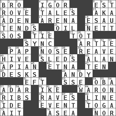 ACROSS 1. Sis' sibling 4. Composer Stravinsky 8. Eastern Standard Time (abbr.) 11. Be footloose 13. Lies 15. Alias (abbr.) 16. An important port of Yemen 17. Sports stadium 18. Son of Isaac 19. Looks after 21. Lubricate 22. Remaining after all deductions 23. Mayday 24. Standoff 27. Small child 29. Synchronize (abbr.) 30. Nick name for Arthur 34. Infant food 36. Sense of smell 39. Break or tear apart 40. Hub of activity 41. Bobsleighs 43. Actor Alda or Thicke 44. Bee-related 46. Inactive volcano in Sicily 47. "___ Little Indians" 48. Writing tables 49. Actor Griffith 51. Bank Draft (abbr.) 53. Compass dir. 54. Chief or king in Benin or Nigeria 57. The sixth month of the Jewish calendar 60. Mamie's mate 63. Make _____ (do battle with) 65. Teases 66. All-night dance parties 69. Actor's bit 70. Binary compound 71. Happening 72. Ancient Roman robe 73. Small island 74. Toward the sea 75. Or not DOWN 1. Naughty children 2. Cowboy competition 3. Baking chambers 4. Call ___ day 5. Slender fish 6. Butter sub 7. Painter Guido (1575-1642) 8. Relaxation 9. Three-handed card game 10. Pulled tight 12. Conclude 14. Table seasoning 18. Plea 20. Filthy place 25. Taverns 26. Learning spot: Fr. 28. Boat paddle 29. Orators 31. Lie 32. _ the terrible 33. Car or cant ending 34. Corncob 35. Opinion 37. Arrange properly for use 38. Ferber et al. 40. Possessed 42. Without 45. Overdraft (abbr.) 50. Morning condensation 52. Become fatigued 54. Greek mythologigal hunter 55. Beat drum 56. Approach 57. Operatic vocal solo 58. "You Light Up My Life" star Conn 59. Collude with 61. Polynesian shrub of the pepper family 62. Nights before holidays 64. The first octave above the treble staff 67. Compass dir. 68. R.R. building