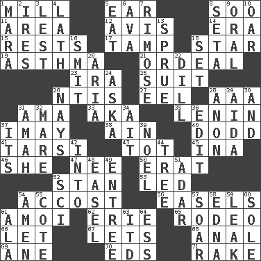 ACROSS 1. Place where flour is made 5. Hearing organ 8. "Barney Miller" actor Jack 11. Type of rug 12. Advice 14. Period 15. Musical pauses 17. Pack (down) 18. Play the lead 19. Respiratory problem 21. Severe or trying experience 23. Lyricist Gershwin 25. Set or collection 26. Nuclear Threat Initiatives 27. Snakelike fish 28. Auto club (abbr.) 31. Housemaid (var.) 33. Alias (abbr.) 35. Soviet premier 1918-24 37. "If ____ say so..." 38. The 18th letter of the Arabic alphabet 40. Texas town _ City 41. Tarsus (plural) 43. Small child 45. _ tizzy (2 wds.) 46. A female animal or person 47. Born 50. Part of Q.E.F. 52. Comedian Laurel of Laurel & Hardy 53. Directed 54. Buttonhole 56. Artist's stands 61. Mine, in Marseilles 62. One of the Great Lakes 65. Cowboy competition 66. Allow 67. Allows 68. Of or related to the anus 69. One (Scot) 70. Begley and Asner 71. Libertine DOWN 1. Hindu Mythology: god of death 2. Angers 3. For fear that 4. Thin strip of wood or metal 5. Ingest 6. Actress Gardner 7. Full of chinks, cracks, or crevices 8. Stalk of a moss capsule 9. Of the mouth 10. Boat paddle 13. Upset 16. Stricken, poetically 18. Put into a specified state 20. Operatic vocal solo 22. Deli pickle 24. "____ silly question..." 26. Negative votes 28. At once, immediately (arch.) 29. Opera by Verdi 30. Plus 31. Nanny 32. Female horse 34. Small island 36. Prepare for publication 37. It is 39. Christmas carol 42. To the inside or interior of 44. Family _ (genealogy) 48. Artist's stand 49. Main course 51. The sixth month of the Jewish calendar 52. _-fi 54. So be it 55. ____ d'Azur (French Riviera) 57. Fly high 58. Pulitzer Prize-winning author Ferber 59. Path through which fluid escapes 60. Flatfish 61. Wing 63. It would 64. Curvy letter