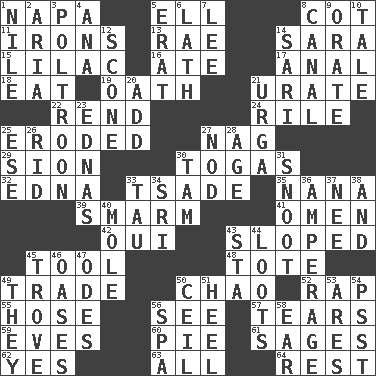 ACROSS 1. California wine valley 5. Pipe bend 8. Small bed 11. Metal shackles 13. Actress Charlotte 14. "Two Mules for Sister ____" 15. Pale purple color 16. Had dinner 17. Of or related to the anus 18. Consume 19. Pledge 21. A salt of uric acid 22. Tear apart 24. Cause heat under the collar 25. Eaten away 27. Tired old horse 29. The Jewish people; Israel 30. Ancient Roman robes 32. Pulitzer Prize-winning author Ferber 33. Sadhe (variant) 35. Nanny 39. Excessive but superficial compliments 41. Sign of things to come 42. Fr. "Yes" 43. Inclined 45. Utensil 48. Carry 49. Swap 50. US Secretary of Labor Elaine L. _ 52. Strike 55. Stockings 56. Observe 57. Rends 59. Nights before holidays 60. Sliced dessert 61. Gurus 62. Affirmative reply 63. 100% 64. Remainder DOWN 1. The longest river in the world 2. Roberta Peters solo 3. Coward 4. Santa ___, CA 5. Part of Q.E.F. 6. Thin strip of wood or metal 7. Area sheltered from the wind 8. Lessep's creation 9. Speak pompously 10. Falsehood 12. Biscuitlike quick bread 14. Indian skirt 20. Say or write further 21. Capital and largest city of Mongolia 23. Ferber et al. 25. Compass dir. 26. To free from 27. Dreamland 28. Personal question 30. Scottish cap 31. Snob 33. The 19th letter of the Greek alphabet 34. _ Lanka 36. Electrical Measurement 37. Born 38. Added to 40. Undercover agent 43. R.R. building 44. Plunders 45. Collection of objects 46. Fertile tracts in a desert 47. Lyric poems 49. Those people 50. To provide with a ceiling 51. Person who is morally reprehensible 53. Ancient Greek god of war 54. Inconspicuous attention getter 56. Health resort 58. Ewer handle