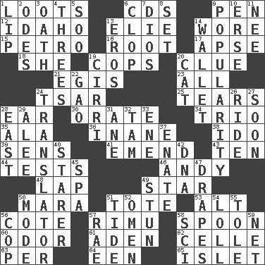 ACROSS 1. Plunders 6. Music discs 9. Animal enclosure 12. Potato state 13. Writer Wiesel 14. Had on 15. Stone: prefix 16. Carrot, for example 17. Domed church section 18. A female animal or person 19. 911 reaches them 20. A slight indication 21. Armor plate that protects the chest 23. 100% 24. Russian ruler of old 25. Pulls into pieces 28. Ewer handle 30. Speak pompously 34. Musical group of three 35. Insect wing 36. Lacking in sense or substance 38. Wedding promise 39. Elected reps. 41. Make improvements or corrections to 43. Nine, plus one 44. Trials 46. Actor Griffith 48. Infant locale 49. Play the lead 50. Hindu Mythology: god of death 51. Carryall 53. Keyboard modifier key 56. ____ d'Azur (French Riviera) 57. Tall New Zealand timber tree 58. Soup utensil 60. Aroma 61. An important port of Yemen 62. Cell (Danish) 63. For each 64. Car or cant ending 65. Small island DOWN 1. Mouth edge 2. Lyric poems 3. Pledge 4. Triads 5. "Barney Miller" actor Jack 6. Hoof sound 7. "Vaya con ____" 8. Arrange properly for use 9. Teen's desire 10. Celtic language 11. Born 13. Greek god of love 14. Place for singles 19. High-altitude cloud 20. Feline 22. E Mali city 24. Interpreter 26. Travel on an animal 27. Within a short period 28. 90 degrees 29. Toward shelter 31. A saturated hydrocarbon 32. Scottish cap 33. Compass dir. 37. Related on the mother's side 40. A viewer who gazes fixedly 42. Heredity factor (abbr.) 45. Health resort 47. Window treatments 49. Surprise greatly 50. Method 51. Periodic rise and fall of the sea level 52. Sign of something about to happen 54. Hang loosely or laxly 55. Lacquered or enameled metalware 56. Police officer (slang) 57. Actress Charlotte 58. _-fi 59. Fish or hair follower