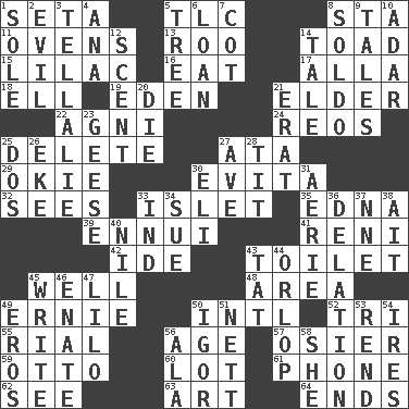 ACROSS 1. Bristle 5. Affectionate concern, for short 8. R.R. building 11. Baking chambers 13. Friend of Pooh 14. Frog relative 15. Pale purple color 16. Erode 17. Silent film actress Nazimova 18. Pipe bend 19. Locale of original sin 21. A person who is older than you are 22. Hindu god of fire 24. Vintage cars 25. Erase 27. "One Day ___ Time" 29. Migrant worker of the '30s 30. Webber/Rice musical 32. Observes 33. Small island 35. Pulitzer Prize-winning author Ferber 39. World-weariness 41. Painter Guido (1575-1642) 42. Binary compound 43. Bathroom 45. Water source 48. Type of rug 49. Bert's buddy 50. International (abbr.) 52. Three (prefix) 55. Monetary unit of Yemen 56. Ripen 57. Flexible twig of a willow tree 59. Von Bismarck 60. Car dealer's back yard 61. Give a jingle 62. Perceive with the eye 63. Tate display 64. Conclusions DOWN 1. Flatfish 2. Tending to cause great harm 3. Copy Pinocchio 4. Santa ___, CA 5. Relationship diagram 6. Grant temporary use of 7. Small bed 8. Twentieth part of a lira 9. Lies 10. The sixth month of the Jewish calendar 12. Aroma 14. Falsehood 20. Expire 21. Part of Q.E.F. 23. Honkers 25. Two (Sp.) 26. Make supply last 27. "___ Maria" 28. Teat (slang) 30. Biblical high priest 31. Nest on high 33. Working for oneself (abbr.) 34. Take to court 36. Accusation by an informer 37. Compass dir. 38. Small island 40. Mediterranean tributary 43. Make lace 44. Fourth or lowest deck 45. Compose 46. Related on the mother's side 47. _ and Stitch 49. Greek god of love 50. Composer Stravinsky 51. Remaining after all deductions 53. Tear apart 54. Angers 56. In the manner of 58. A female animal or person