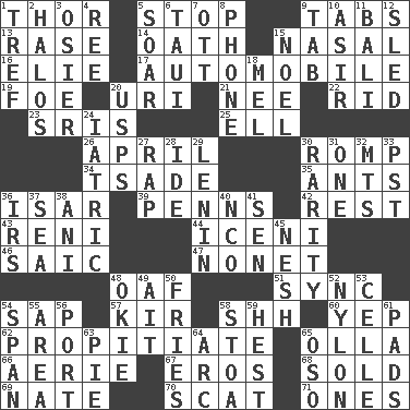 ACROSS 1. Son of Odin 5. Discontinue 9. Bar bills 13. Raze (variant) 14. Pledge 15. Rhinal 16. Writer Wiesel 17. Form of transportation 19. Enemy 20. RI univ. 21. Born 22. To free from 23. Indian titles of respect 25. Pipe bend 26. Showery time 30. Frolic 34. Sadhe (variant) 35. Pismires 36. Austrian river, tributary to the Danube 39. Actor Sean's family 42. Take ten 43. Painter Guido (1575-1642) 44. Ancient Celtic tribe of eastern Britain 46. Ketch in the Levant 47. Music written for nine 48. Clumsy lout 51. Synchronize (abbr.) 54. Plant excrement 57. Apertif with cassis 58. Quiet! 60. Slangy assent 62. Conciliate 65. Rounded earthenware pot or jar 66. Nest on high 67. Greek god of love 68. Disposed of to a purchaser 69. Nathan's nickname 70. Scram! 71. Singles DOWN 1. Not kosher 2. Radiant circles of light 3. Flexible twig of a willow tree 4. Portuguese money of account (variant) 5. Fly high 6. "Change" in Tahitian 7. Baseball player Mel 8. Give a jingle 9. Bar bill 10. SW Saudi Arabia district 11. Indonesian resort city 12. Downhill vehicle 15. Christmas carol 18. Cartoonist voice _ Blanc 20. United States Postal Service (abbr.) 24. Of or pertaining to medicine 27. Strike 28. Binary compound 29. Soviet premier 1918-24 30. Noteworthy scarcity 31. Single 32. Mountains (abbr.) 33. Pacific Standard Time (abbr.) 36. Big collection agency 37. Ocean 38. Black tropical American cuckoo 40. Non-commissioned officer (abbr.) 41. Elected rep. 45. Soft 48. Migrant worker of the '30s 49. Small island 50. Strips of potato fried in deep fat 52. High-strength synthetic material 53. Cell (Danish) 54. Connect, as a bridge 55. Length times width 56. Sweet dark-red dessert wine 58. Portico 59. Behest 61. Groovy apts. 63. Sliced dessert 64. Curve 65. Bear (Spanish)