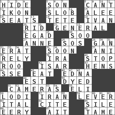 ACROSS 1. Flintstone garb 5. Male offspring 8. Patter 12. Visual representation of an object 13. Messy guy 15. Toward shelter 16. Theater features 18. False hair 19. _ the terrible 20. To free from 22. Commissioned military rank 24. Mild oath 26. "Barney Miller" actor Jack 27. Queen of England 1702-14 28. Mayday 29. Separate the seeds from cotton 32. Part of Q.E.F. 35. Within a short period 37. Cuckoo 38. Trust 39. Lyricist Gershwin 40. Close up, plug up 41. Friend of Pooh 42. Austrian river, tributary to the Danube 43. Coop moms 44. Compass dir. 45. Consume 46. Pulitzer Prize-winning author Ferber 49. Eastern Standard Time (abbr.) 50. Colored 51. Devices for capturing images 55. Biblical high priest 56. Farming town in central California 57. SW Asia republic 59. Prying instrument 63. Slanted text style (abbr.) 64. Quote 65. Drop; flow; fall 66. Suggestive of the supernatural 67. Small island 68. Docile DOWN 1. Part of HMS, perhaps 2. Mamie's husband 3. ___ good deed 4. Plea 5. Fast jet (abbr.) 6. Cassini of fashion 7. Make mention of 8. Capital of Egypt 9. Inventor's middle name 10. Actress Patricia 11. Nine, plus one 14. Gillaume's butler role 17. Signal 21. Daniel's nick name 23. Greek goddess of the dawn 25. Cease 28. Flew 29. Yard entry 30. At once, immediately (arch.) 31. Pinches, bites 32. Blunders 33. Vintage cars 34. _ vera 36. Mouth or opening 40. Most dark, concealed or hidden 42. Of or pertaining to medicine 45. Compass dir. 47. Color 48. 1994 drama film starring Jodie Foster 49. Poet Dickinson 51. ____ d'Azur (French Riviera) 52. The sixth month of the Jewish calendar 53. Operatic vocal solo 54. Suttee (variant) 56. Falsehood 58. Fish or hair follower 60. By way of 61. Shade tree 62. Portuguese money of account (variant)