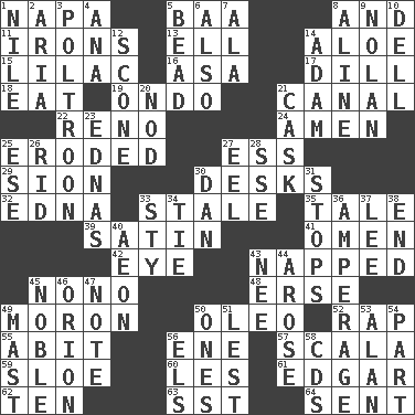 ACROSS 1. California wine valley 5. Sound made by sheep 8. Added to 11. Removes the wrinkles 13. Pipe bend 14. _ vera 15. Pale purple color 16. White ___ sheet 17. Deli pickle 18. Erode 19. Southwest Nigerian state 21. Lessep's creation 22. Former U.S. Attorney General Janet 24. So be it 25. Worn away 27. Double-curved letter 29. The Jewish people; Israel 30. Writing tables 32. Pulitzer Prize-winning author Ferber 33. Showing deterioration from age 35. Falsehood 39. Smooth fabric 41. Sign of things to come 42. Sight organ 43. Slept 45. Words to Nanette 48. Celtic language 49. Person of subnormal intelligence 50. Margarine 52. Strike 55. "This won't hurt ____!" 56. Compass dir. 57. Any of the three canals of the cochlea 59. A type of plum 60. French article 61. _ Allan Poe 62. Nine, plus one 63. Fast jet (abbr.) 64. Transmitted DOWN 1. Mediterranean tributary 2. Operatic vocal solo 3. Coward 4. Santa ___, CA 5. Necklace unit 6. In addition 7. Wing 8. Place in a line 9. Pitcher Ryan 10. Small valley 12. Biscuitlike quick bread 14. First of billions? 20. Allow head to fall sleepily 21. Keg 23. Ferber et al. 25. Compass dir. 26. To free from 27. Snakelike fish 28. Compass dir. 30. One of the 12 tribes of Israel 31. Obstructs or blocks passage 33. Filthy place 34. Standoff 36. Electrical Measurement 37. Area sheltered from the wind 38. Conclude 40. Period of immesurable duration 43. Born 44. Came up 45. Impressive in appearance 46. Constellation of myth 47. Brief written record 49. Vertical spar for supporting sails 50. Washington bills 51. For fear that 53. ____ Jay Lerner 54. Piece 56. Raised railways 58. Music discs