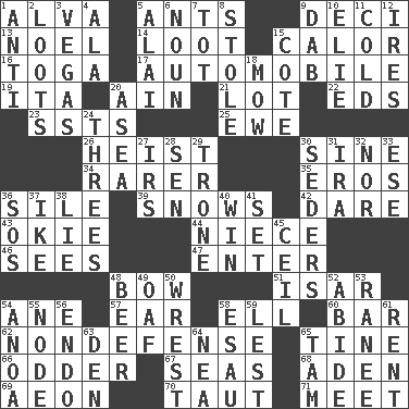 ACROSS 1. Inventor's middle name 5. Pismires 9. Tenth: prefix 13. Christmas carol 14. Plunder 15. Bodily heat indicating an inflammation 16. Ancient Roman robe 17. Car 19. Call ___ day 20. The 18th letter of the Arabic alphabet 21. Car dealer's back yard 22. Begley and Asner 23. Fast planes 25. She-sheep 26. Robbery 30. Trig term 34. More uncommon 35. Greek god of love 36. Drop; flow; fall 39. Overwhelms 42. Have the gumption 43. Migrant worker of the '30s 44. Sibling's daughter 46. Perceives with the eye 47. Keyboard key 48. Ribbon knot 51. Austrian river, tributary to the Danube 54. One (Scot) 57. Hearing organ 58. Pipe bend 60. Oblong piece of solid material 62. Unrelated to defense, as in spending 65. Prong on a fork 66. More peculiar 67. Oceans 68. Arabian gulf 69. Age 70. Strained 71. Confront DOWN 1. Opposed to 2. Plunders 3. Viva Las _ 4. Wing 5. Mountain range southwest of Kyrgyzstan 6. Part of speech 7. Small child 8. Fur scarf 9. Pat or tap gently 10. Writer Wiesel 11. Having a low temperature 12. Angers 15. ____ d'Azur (French Riviera) 18. Cut the grass 20. Toward the sea 24. Triplets 27. Big collection agency 28. Elected rep. 29. Heavy duty weighing machine 30. Spring feasts 31. Retirement account (abbr.) 32. Or not 33. Compass dir. 36. Mayday 37. Mamie's husband 38. Whopper 40. Acquire through effort 41. Arrange properly for use 45. To provide with a ceiling 48. Fermented drink made from hops 49. Clumsy lout 50. Take or capture by force 52. Tolerate 53. Indian princess (variant) 54. Small Philippine buffalo 55. Connecting point 56. Inside; within (prefix) 58. Son of Isaac 59. For fear that 61. Monthly bill 63. Lair 64. Teachers' org. 65. Scottish cap