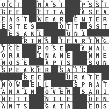 ACROSS 1. Sep. follower 4. Political cartoonist Thomas 8. Inconspicuous attention getter 12. Unit of force equal to gravity 13. Singer James 14. Toward the sea 15. Compass direction 17. Erode 18. Keyboard key 19. _____ Park, CO 21. Baseball player Mel 23. Fast jet (abbr.) 24. 1973 Nobel Price Winner (Physics) Leo 26. Single; one (prefix) 28. Basketball hoops 30. Pulling apart 34. Frozen water 37. Introduce or present, as a question 39. Of or related to the anus 40. Mouth or opening 41. Silly 43. Compass dir. 44. Characteristic smell of wine 46. Flats, for short 47. Boy, to dad 48. Orator 51. Ketch in the Levant 54. Portuguese money of account (variant) 55. A salt of uric acid 58. At this time 61. Pipe bend 63. Small fatty European fish 65. With great haste 67. Baking chamber 71. Indian skirt 72. Remaining after all deductions 73. Mediterranean tributary 74. Lair 75. Pismires 76. Greek goddess of the earth (variant) 77. Begley and Asner DOWN 1. Double curve, resembling the letter S 2. Stop 3. Trials 4. ___ Haven, CT 5. Had dinner 6. R.R. building 7. Pacific island yam 8. Baking dish 9. Fast planes 10. Perceives with the eye 11. Small pie 16. Lacerate 18. Inactive volcano in Sicily 20. What Jean-Claude Killy likes to do 22. Third day of the wk. 25. Body of Kaffir warriors 27. Retirement account (abbr.) 29. Echolocation 30. Portable shelters 31. Lodging establishments 32. Billionth: prefix 33. Small, secluded valley 34. Charged particles 35. Riding implement 36. Relaxation 38. Plant excrement 42. Son of Isaac 45. Ewer handle 49. Peachy ____! 50. Snakelike fish 52. Big collection agency 53. Balmoral and tarboosh 56. Exchange 57. Having ears or earlike features 58. Grandmother 59. Sign of things to come 60. Electrical Unit 62. Protracted 64. Canisters 66. ___ a Wonderful Life 68. By way of 69. Biblical high priest 70. Teachers' org.