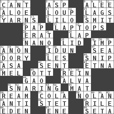 ACROSS 1. Patter 5. Viper 8. Toward shelter 12. Medicinal plant 13. Central Nebraska county 15. Fails to keep up a pace 16. Entertaining tales 18. _ and Stitch 19. Stricken, poetically 20. Infant food 22. Portable computers 24. Part of Q.E.F. 26. Infant locale 27. Billionth: prefix 28. Flaplike covering 29. Naughty child 32. At once, immediately (arch.) 35. Goddess of spring and wife of Bragi 37. Ocean 38. Rowboat 39. French article 40. Clip 41. White ___ sheet 42. Transmitted 43. Inactive volcano in Sicily 44. Cartoonist voice _ Blanc 45. Baseball player Mel 46. It's straight from the horse's mouth 49. E Mali city 50. Inventor's middle name 51. Catching in a trap 55. Floor protector 56. 480, 500 or 516 sheets of paper 57. Root beer relative 59. Pitcher Ryan 63. Against 64. Proofreading order 65. Cause heat under the collar 66. Locale of original sin 67. Compass dir. 68. Stalk of a moss capsule DOWN 1. Island 2. Wing 3. And not 4. 3-inch nail 5. 100% 6. The visible part of the earth's surface 7. Monetary unit of Botswana 8. Columnist Joseph or Stewart 9. Desk light 10. The front part of a cuirass 11. Eastern Standard Time (abbr.) 14. Cotton for raincoats, e.g. 17. "Two Mules for Sister ____" 21. Baking dish 23. Bit 25. Bathroom 28. A period of five years 29. Is not 30. Count _ (2 wds.) 31. Dad 32. First of billions? 33. Characteristic smell of wine 34. Taken by mouth 36. Lair 40. Elected representatives 42. Unemotional ones 45. Rowing implement 47. Shade tree 48. "Terrible" tsar 49. Street urchin 51. Transmit 52. Nathan's nickname 53. Musical sound 54. Small, secluded valley 56. Actress Charlotte 58. Had dinner 60. Untruth 61. The first octave above the treble staff 62. Teachers' org.