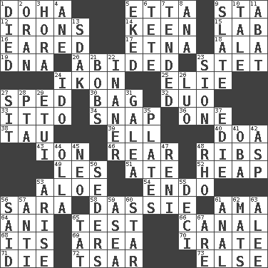 ACROSS 1. Capital of the state of Qatar 5. Singer James 9. R.R. building 12. Removes the wrinkles 14. Peachy ____! 15. Experiment locale 16. Having ears or earlike features 17. Inactive volcano in Sicily 18. Chicken ___ king 19. Heredity factor (abbr.) 20. Remained 23. Proofreading order 24. Visual representation of an object 25. Writer Wiesel 27. Broke a traffic law 30. Paper or plastic container 32. Superhero pair 33. "Tell ____ the Marines!" 34. Fastener 36. Single 38. The 19th letter of the Greek alphabet 39. Pipe bend 40. ___ good deed 43. Electrically charged atom 46. Stern 48. Chest bones 49. French article 51. Had dinner 52. Pile 53. _ vera 54. Inside; within (prefix) 56. "Two Mules for Sister ____" 58. Hyrax 61. Nursemaid (var.) 64. Cuckoo 65. Trial 66. Lessep's creation 68. ___ a Wonderful Life 69. Length times width 70. Feeling or showing extreme anger 71. Pass on 72. Russian ruler of old 73. Otherwise DOWN 1. Passed on 2. Northwest Algerian city 3. Israeli folk dance 4. One (Scot) 5. Made supply last 6. Wig 7. Watched over 8. Santa ___, CA 9. Schedule 10. Story 11. Blind as ____ 13. Neighbor of Neb. 21. Moves up and down 22. More lacking in sense or substance 23. The Jewish people; Israel 24. Wedding promise 26. Nilotic language 27. Be seated 28. Parent Teacher Association (abbr.) 29. Needle holder 31. An organ shaped like a helmet 35. Food holders 37. Singer Brickell 41. Chief or king in Benin or Nigeria 42. Viper 44. Water jar 45. Modern: prefix 47. Painter Guido (1575-1642) 48. 17th letter of the Greek alphabet 50. Spring feasts 53. Get up 55. Tenth: prefix 56. Expressed in words 57. Opposed to 59. At sea 60. Play the lead 61. Of or related to the anus 62. Floor coverings 63. Toward shelter 65. Make lace 67. "We ___ not amused" (Victoria)