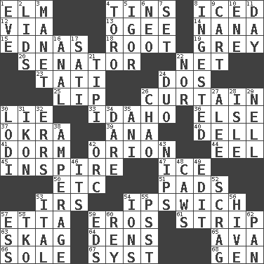 ACROSS 1. Shade tree 4. Airtight sealed metal containers 8. On the rocks 12. By way of 13. Double curve, resembling the letter S 14. Nanny 15. Ferber et al. 18. Carrot, for example 19. Jennifer or Joel 20. Legislator 22. Fish or hair follower 23. Jacques of French films 24. Two (Sp.) 25. Mouth edge 26. Window treatment 30. Untruth 33. Potato state 36. Otherwise 37. Gumbo ingredient 39. Santa ___, CA 40. Small valley 41. Dormintory (informal) 42. Greek mythologigal hunter 44. Snakelike fish 45. Stimulate to action 47. Frozen water 50. And so on (abbr.) 51. Writing tablets 53. Big collection agency 54. NE Massachusetts town 57. Singer James 59. Greek god of love 61. Empty completely 63. Heroin 64. Habitations of wild animals 65. Actress Gardner 66. Not divided or shared with others 67. System (abbr.) 68. Commissioned mil. rank DOWN 1. Night before a holiday 2. Flaplike coverings 3. French painter Edouard 4. "Corrida" creature 5. Composer Stravinsky 6. Modern: prefix 7. Put into a specified state 8. Eaten 9. Draw slowly or heavily 10. Compass dir. 11. 24 hours 16. Of or related to the anus 17. Suttee (variant) 21. Native american tent (variation) 22. Not either 24. Superhero pair 26. US Secretary of Labor Elaine L. _ 27. Toward shelter 28. Capri or Wright 29. 1994 drama film starring Jodie Foster 30. Farming town in central California 31. Visual representation of an object 32. Blunders 34. Have the gumption 35. Black tropical American cuckoo 38. Electrical Measurement 42. The grampus (Milton) 43. Pinches, bites 46. It is 48. Crow sounds 49. Prepare for publication 52. Strangle with an iron collar 53. Slanted text style (abbr.) 54. Charged particles 55. Inconspicuous attention getter 56. Hub of activity 57. Double-curved letter 58. Ring climax 59. Begley and Asner 60. Marina Del _, California 62. Baking dish
