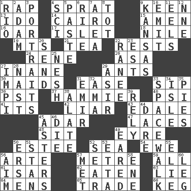 ACROSS 1. Hit sharply and swiftly 4. Small fatty European fish 9. Peachy ____! 13. Wedding promise 14. Capital of Egypt 15. So be it 16. Rowing implement 17. Small island 18. "Death on the ____" 19. Mountains (abbr.) 21. Beverage made from leaves 22. Musical pauses 24. French philosopher Descartes 26. White ___ sheet 27. Silly 29. Pismires 30. Women servants 31. Comfort 33. Small drink 36. Pacific Standard Time (abbr.) 37. More given to overacting 40. 23rd letter of the Greek alphabet 41. ___ a Wonderful Life 42. One who doesn't tell the truth 43. Peak District village in England 45. The sixth month of the Jewish calendar 47. Shoestrings 48. Be seated 49. Jane of fiction 50. First name in cosmetics 52. Ocean 54. She-sheep 56. Johnson of "Laugh-In" 57. Distance measurement (Brit.) 59. Everything 61. Austrian river, tributary to the Danube 62. Eroded 63. Whopper 64. Not women's 65. Buy and sell 66. Cask DOWN 1. _ de Janeiro 2. First of billions? 3. Likenesses of persons 4. _-fi 5. Thick mixture 6. Cause heat under the collar 7. Length times width 8. Small child 9. Sunflower state 10. Give off 11. Snakelike fish 12. Compass dir. 20. Transmit 22. The wife of a rajah (variant) 23. Eastern Standard Time (abbr.) 25. Delicate 27. Body of Kaffir warriors 28. Political cartoonist Thomas 29. SW Saudi Arabia district 31. Independent ruler or chieftain 32. Nanny (var.) 33. High altitude stroll 34. Capri or Wright 35. Sliced desserts 38. Having winglike extensions 39. Have confidence or faith in 44. Have the gumption 45. Michaelmas daisies 46. Expire 49. Having ears or earlike features 50. Celtic language 51. Comedian Laurel of Laurel & Hardy 52. Burn superficially 53. Singer James 55. Writer Wiesel 56. Direct toward a target or goal 57. Was introduced to 58. Compass dir. 60. Part of a journey