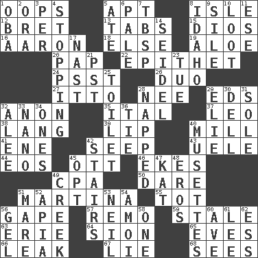 ACROSS 1. I made a mistake 5. Fitting 8. Capri or Wright 12. Cy Young winner Saberhagen 13. Bar bills 15. "Vaya con ____" 16. Composer Copland 18. Otherwise 19. _ vera 20. Infant food 22. Curse 24. Inconspicuous attention getter 26. Superhero pair 27. "Tell ____ the Marines!" 28. Born 29. Begley and Asner 32. Soon (poet.) 35. Slanted text style (abbr.) 37. Lion 38. Austrian-born American filmmaker Fritz 39. Mouth edge 40. Place where flour is made 41. Compass dir. 42. Ooze 43. Ubangi River tributary 44. Greek goddess of the dawn 45. Baseball player Mel 46. Makes supply last 49. Numbers guy (abbr.) 50. Have the gumption 51. Chrissie's court nemesis 55. Small child 56. Open wide 57. San ____ (Riviera town) 59. Lacking originality or spontaneity 63. One of the Great Lakes 64. The Jewish people; Israel 65. Nights before holidays 66. Path through which fluid escapes 67. Falsehood 68. Perceives with the eye DOWN 1. Chief or king in Benin or Nigeria 2. Mouth or opening 3. For each 4. Closing up, plugging up 5. Had dinner 6. Light colored 7. Cook's measure (abbr.) 8. Potato state 9. Drop; flow; fall 10. Plunder 11. Compass dir. 14. Beer mug 17. Political cartoonist Thomas 21. Pacific Standard Time (abbr.) 23. Third day of the wk. 25. Rest room 28. Slept 29. Writer Wiesel 30. Small valley 31. Not divided or shared with others 32. Toward shelter 33. Billionth: prefix 34. Singles 36. Neckwear 40. French bagpipes 42. Flight of steps 45. Elect 47. Krazy ___ of comics 48. Greek god of love 49. Small stream 51. Female horse 52. Capital of Western Samoa 53. Famous astronaut Armstrong 54. Mine, in Marseilles 56. Set 58. Single 60. "___ Maria" 61. Area sheltered from the wind 62. Curvy letter