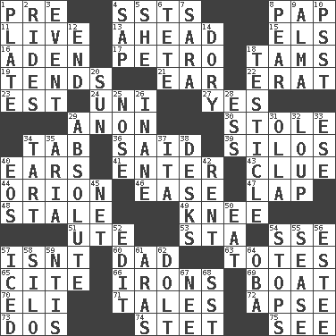 ACROSS 1. Before (prefix) 4. Fast planes 8. Infant food 11. Not recorded 13. Forward in time 15. Raised railways 16. Arabian gulf 17. Stone: prefix 18. Scottish caps 19. Watches over 21. Ewer handle 22. Part of Q.E.F. 23. Eastern Standard Time (abbr.) 24. Corn or form start 27. It is so 29. Soon (poet.) 30. Fur scarf 34. Bar bill 36. Stated 39. Grain storage towers 40. Hearing organs 41. Keyboard key 43. A slight indication 44. Constellation of myth 46. Comfort 47. Pet locale 48. Lacking originality or spontaneity 49. Leg joint 51. Shoshoni 53. R.R. building 54. Compass dir. 57. Is not 60. Male parent 63. Hauls 65. Quote 66. Removes the wrinkles 69. Water vessel 70. Biblical high priest 71. Lies 72. Domed church section 73. Two (Sp.) 74. Proofreading order 75. Observe DOWN 1. Food holder 2. Amusement-park features 3. Happening 4. Plant excrement 5. A female animal or person 6. Wig 7. "Two Mules for Sister ____" 8. Lightbulb-shaped fruit 9. _ mater 10. Inconspicuous attention getter 12. Conclusion 14. Rowboat 18. One of the two male reproductive glands 20. Player for Phoenix 25. Characteristic smell of wine 26. Lacking in sense or substance 28. Double-curved letter 29. Utter; complete 31. Water jar 32. Central Nebraska county 33. Compass dir. 34. Small pie 35. Roberta Peters solo 37. Call ___ day 38. Writing tables 40. Greek goddess of the dawn 42. Monthly bill 45. Fish or hair follower 50. Consume 52. Prepare for publication 54. Halts 55. Gospel singer Marvin 56. First name in cosmetics 57. On the rocks 58. Grain storage tower 59. Nuclear Threat Initiatives 61. Caspian sea tributary 62. Stupid person 64. Chief or king in Benin or Nigeria 67. Born 68. Fast jet (abbr.)
