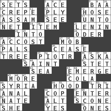 ACROSS 1. Puts into a specified state 5. Adept person 8. Sound made by sheep 11. Streamer paper 13. Apply oneself diligently 14. Stockings 15. Indian state 16. Observe 17. To (old English) 18. Fish or hair follower 19. Detail 21. Soviet premier 1918-24 22. To the inside or interior of 24. River in Europe 25. Buttonhole 27. Crowd into 29. Friends 30. Desist 32. Family _ (genealogy) 33. Peter (Polish) 35. "____ silly question..." 39. Inhabitant of Heaven 41. Proofreading order 42. Ocean 43. Develop 45. Greater amount 48. Root beer relative 49. Damascus' land 50. Parka part 52. Three (prefix) 55. Of or related to the anus 56. Police officer (slang) 57. Keyboard key 59. Nathan's nickname 60. The first octave above the treble staff 61. Biscuitlike quick bread 62. A female animal or person 63. It is so 64. Washington bills DOWN 1. Examine hastily 2. Celtic language 3. One of the two male reproductive glands 4. Health resort 5. Domed church section 6. To starve (Brit.) 7. Sight organ 8. Child's nurse 9. Being in motion 10. Period of immesurable duration 12. Sends forth 14. Became colored 20. Small child 21. Tennis shots 23. Olfactory organs 25. Fitting 26. Auto 27. Was introduced to 28. Boat paddle 30. Small bed 31. Artist's stand 33. Sliced dessert 34. _ tizzy (2 wds.) 36. Ski resort town in Vermont 37. Barrel 38. Had dinner 40. Toward the sea 43. Environmental prefix 44. Methods 45. Non-adult bird? 46. Declaim 47. Cause heat under the collar 49. Without 50. Hollow 51. Chooses 53. French philosopher Descartes 54. Angers 56. Island 58. Non-commissioned officer (abbr.)