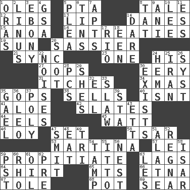 ACROSS 1. Cassini of fashion 5. Parent Teacher Association (abbr.) 8. Story 12. Chest bones 13. Mouth edge 14. Natives or inhabitants of Denmark 15. Small Philippine buffalo 16. Pleas 19. Player for Phoenix 20. More disrespectful 21. Synchronize (abbr.) 23. Single 24. Part of HMS, perhaps 27. I made a mistake 30. Suggestive of the supernatural 31. Strong, restless desires 34. Dec. holiday 35. Republicans 38. Makes a sale 40. Is not 41. _ vera 42. Chalkboards 44. Snakelike fish 45. Electrical Unit 46. Myrna of the movies 47. Put into a specified state 50. Russian ruler of old 53. Chrissie's court nemesis 57. Flowery wreath 59. Conciliate 63. Straggles 64. Upper-body garment 65. Mountains (abbr.) 66. Inactive volcano in Sicily 67. Lacquered or enameled metalware 68. Plant holder 69. Scorch DOWN 1. Mouths or openings 2. "_ and Lucy" (Charlie Brown theme song) 3. Dark wood 4. Girls' org. (abbr.) 5. Entreaty 6. Metal containers 7. Tenement units (abbr.) 8. Make lace 9. Black tropical American cuckoo 10. Area sheltered from the wind 11. Double-curved letter 14. Have the gumption 17. _ de Janeiro 18. Car or cant ending 20. Native of Scotland 22. Annoying sounds 24. Folds over and sews together 25. SW Asia republic 26. System (abbr.) 28. Personal Computers (abbr.) 29. "______ My Girl" (Turtles hit) 30. Has an existence 32. Pipe bend 33. Cole _ (cabbage dish) 35. Highlander 36. Butter sub 37. Much (prefix) 39. R.R. building 43. Singer James 47. Stricken, poetically 48. Consume 49. Three (prefix) 51. Having winglike extensions 52. Rain (Swedish) 54. Pack (down) 55. "Tell ____ the Marines!" 56. A home for chicks 58. Austrian river, tributary to the Danube 59. Pacific Standard Time (abbr.) 60. 17th letter of the Greek alphabet 61. Lubricate 62. Before (prefix) 63. French article