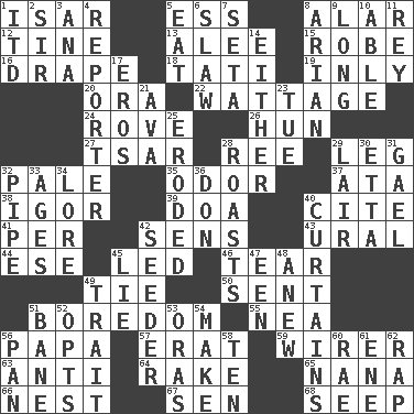 ACROSS 1. Austrian river, tributary to the Danube 5. Curvy letter 8. Having or resembling wings 12. Prong on a fork 13. Toward shelter 15. Loose flowing garment 16. Window treatment 18. Jacques of French films 19. Inwardly 20. Mouth or opening 22. Electrical Measurement 24. Be footloose 26. Attila the _ 27. Russian ruler of old 28. Portuguese money of account (variant) 29. Part of a journey 32. Light colored 35. Aroma 37. _ moment's notice (2 wds.) 38. Russian composer Stravinsky 39. ___ good deed 40. Quote 41. For each 42. Elected reps. 43. Mountain range 44. Compass dir. 45. Directed 46. Lacerate 49. Neckwear 50. Emitted 51. Mood resulting from idleness 55. Teachers' org. 56. Dad 57. Part of Q.E.F. 59. One who wires 63. Against 64. Immoral or dissolute person 65. Grandmother 66. Egg locale 67. Elected rep. 68. Ooze DOWN 1. It would 2. Title for a knight 3. Santa ___, CA 4. News announcer 5. Erode 6. Cole _ (cabbage dish) 7. Bristle 8. Believer in; advocate of (suffix) 9. Yearn 10. Competent 11. Marina Del _, California 14. One or the other of two 17. Greek god of love 21. Actress Gardner 23. Third day of the wk. 25. Eaten away 28. Exposes to great heat 29. Den 30. Singer James 31. Highlander 32. Corncob 33. Ripens 34. Old wives' tales, e.g. 36. Spanish title 40. Window treatments 42. Sowing specialist 45. Untruth 47. Car or cant ending 48. Afresh 49. Distinguishing feature 51. Object of repulsion 52. Chooses 53. Mouths or openings 54. Create 56. Baking dish 58. Nine, plus one 60. Actress Charlotte 61. Compass dir. 62. Strike