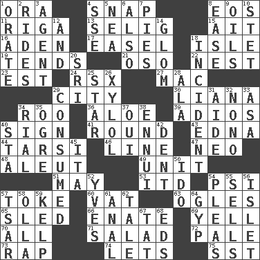 ACROSS 1. Mouth or opening 4. Fastener 8. Greek goddess of the dawn 11. Port city in Latvia 13. Former Milwaukee Brewers owner Bud 15. Small island 16. Arabian gulf 17. Artist's stand 18. Small island 19. Is inclined (to) 21. Bear (Spanish) 22. Egg locale 23. Eastern Standard Time (abbr.) 24. Acura sports coupe 27. Big _ 29. Municipality 30. Woody, climbing, usually tropical plant 34. Friend of Pooh 36. _ vera 39. Goodbye (Sp.) 40. Public display of a written message 41. Single shot of ammunition 43. Pulitzer Prize-winning author Ferber 44. Tarsus (plural) 46. Actor's bit 47. Modern: prefix 48. Eskimo relative 49. A single undivided whole 51. Can I? 53. It would 54. 23rd letter of the Greek alphabet 57. Casino tip 60. Large container 63. Stares at amorously 65. Downhill vehicle 66. Related on the mother's side 69. Shout 70. Everything 71. First course 72. Diluted with white 73. Reproach for some lapse or misdeed 74. Allows 75. Fast jet (abbr.) DOWN 1. Speak pompously 2. Amusement-park features 3. Representative 4. Compass dir. 5. Teachers' org. 6. In addition 7. Sliced desserts 8. Relaxation 9. Lubricates 10. Proofreading order 12. Also 14. Take by theft 18. Event 20. Indian title of respect (Mr.) 25. Play the lead 26. Xylene (variant) 28. Chicken ___ king 29. Eaten 31. Helper 32. Words to Nanette 33. White ___ sheet 34. Monetary unit of Yemen 35. Legendary monster 37. Fr. "Yes" 38. World-weariness 40. R.R. building 42. Gouge 45. Call ___ day 50. Wedding promise 52. Jacques Cousteau's middle name 54. Entreaties 55. Makes a sale 56. Small island 57. Russian ruler of old 58. Water jar 59. Seaweed 61. Of or related to the anus 62. Story 64. Flimflam 67. Make lace 68. Begley and Asner