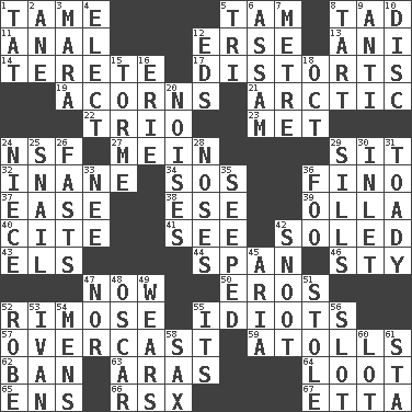 ACROSS 1. Docile 5. Scottish cap 8. Small amount or degree 11. Of or related to the anus 12. Celtic language 13. Black tropical American cuckoo 14. Cigar-shaped 17. What propaganda does 19. Oak nuts 21. Northern region 22. Musical group of three 23. Was introduced to 24. Science/research agcy. 27. Count _ (2 wds.) 29. Be seated 32. Empty; void 34. Mayday 36. A pale, very dry sherry 37. Comfort 38. Compass dir. 39. Spanish pot 40. Quote 41. Perceive with the eye 42. Having a sole or soles 43. Raised railways 44. Connect, as a bridge 46. Filthy place 47. At this time 50. Greek god of love 52. Full of chinks, cracks, or crevices 55. Foolish or stupid persons 57. Cloudy 59. Ringlike coral islands and reefs 62. Bar 63. Ancient river in northeast Turkey 64. Plunder 65. Followers of ems 66. Acura sports coupe 67. Singer James DOWN 1. Make lace 2. One (Scot) 3. Hindu Mythology: god of death 4. Opt 5. Three (prefix) 6. Indian state 7. Distance measurement (Brit.) 8. Small pie 9. Against 10. Plate 12. Begley and Asner 15. Singer Mel 16. 4th largest of the Great Lakes 18. Sep. follower 20. Annoying sounds 24. Sibling's daughter 25. Slow-paced one 26. Goes without food and/or water 28. Olfactory organs 29. Beverly of Met fame 30. An arm off of a larger body of water 31. Sycophant 33. Born 35. Oozed 36. Egg _ yung 42. Snob 45. Operatic vocal solo 47. Or not 48. Witty Wilde 49. Puts on (as clothing) 51. Fur scarf 52. Loose flowing garment 53. "Terrible" tsar 54. Not women's 55. It is 56. Notch 58. Saxophone 60. Car dealer's back yard 61. R.R. building