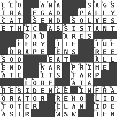 ACROSS 1. Lion 4. Santa ___, CA 7. Settles 11. Lyricist Gershwin 12. Mild oath 13. Chummy 14. Feline 15. Transmit 16. Finds the solution 17. Moral principle 19. Helper 21. June honoree 23. Ancient Greek god of war 24. Suggestive of the supernatural 25. Standoff 26. Third day of the wk. 29. Window treatment 30. Followers of ems 31. Portuguese money of account (variant) 32. "Barney Miller" actor Jack 33. Ingest 34. 100% 35. Conclusion 36. Armed conflict 37. First class 40. Had dinner 41. ___ a Wonderful Life 42. Canvas cover 43. Old wives' tales, e.g. 45. _ moment's notice (2 wds.) 46. Home 51. Kind of red light 55. Speaker 56. San ____ (Riviera town) 58. Hat (slang) 59. Carrier 60. Style 61. Binary compound 62. SW Saudi Arabia district 63. Compass dir. 64. Nine, plus one DOWN 1. Louse (plural) 2. Part of Q.E.F. 3. Pledge 4. Mature 5. Grandmother 6. Does sums 7. Table seasonings 8. Inventor's middle name 9. Small, secluded valley 10. System (abbr.) 12. Fortification 13. Airs 16. Founders of families 18. The main thing one is thinking about 20. Virtuous person 22. Color 24. Wear away 25. Pulls into pieces 26. _____ steamer (cargo ship) 27. Ubangi River tributary 28. Snakelike fish 29. Do not 32. Ocean 33. Consumed 36. One who wires 37. Parent Teacher Assoc. 38. Food allowance for one day 39. SW Asia republic 43. 61 cubic inches 44. Aroma 46. Roll call or roster of names 47. Greek god of love 48. Suttee (variant) 49. Group working together 50. Snakelike fish 52. Secret move to avoid paying debts 53. Travel on an animal 54. An important port of Yemen 57. Opening into something insatiable
