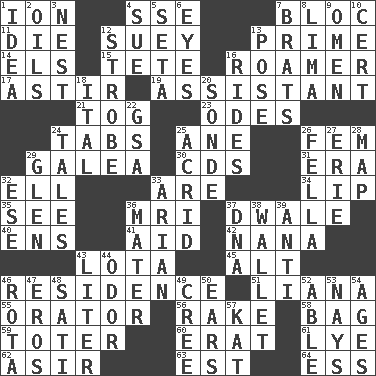 ACROSS 1. Electrically charged atom 4. Compass dir. 7. Alliance 11. Expire 12. Chop _ 13. First class 14. Raised railways 15. Wig 16. Wanderer 17. Being in motion 19. Aide 21. Coat; cloak 23. Lyric poems 24. Bar bills 25. A saturated hydrocarbon 26. Opposite of masc. 29. An organ shaped like a helmet 30. Music discs 31. Period 32. Pipe bend 33. "We ___ not amused" (Victoria) 34. Mouth edge 35. Perceive with the eye 36. Medical imaging device (abbr.) 37. A sleeping potion; an opiate (poet.) 40. Followers of ems 41. Assist 42. Nanny 43. Globular water bottle used in Asia 45. The first octave above the treble staff 46. Home 51. Climbing, woody, usually tropical vines 55. Speaker 56. Libertine 58. Paper or plastic container 59. Carrier 60. Part of Q.E.F. 61. Sodium hydroxide 62. SW Saudi Arabia district 63. Eastern Standard Time (abbr.) 64. Double-curved letter DOWN 1. The main thing one is thinking about 2. Petroleums 3. A home for chicks 4. Institute legal proceedings 5. Bristle 6. Sight organs 7. Naughty children 8. Pale green bean 9. Presage 10. An absolute certainty 12. Disco prop 13. Introduce or present, as a question 16. Amusement-park features 18. Slanted text style (abbr.) 20. Message 22. Girls' org. (abbr.) 24. Lies 25. Bitter 26. Chap (slang) 27. 4th largest of the Great Lakes 28. Atlas unit 29. Small, secluded valley 32. Compass dir. 33. Believer in; advocate of (suffix) 36. Mother 37. Heredity factor (abbr.) 38. Place for singles 39. Opposed to 43. 61 cubic inches 44. Scent 46. Roll call or roster of names 47. Greek god of love 48. Suttee (variant) 49. Algonquian 50. Hearing organs 52. Competent 53. Negative votes 54. Eras 57. Krazy ___ of comics