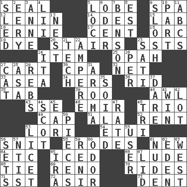 ACROSS 1. Lick closed 5. Ear part 9. Health resort 12. Soviet premier 1918-24 14. Lyric poems 15. Experiment locale 16. Bert's buddy 17. Penny 18. The grampus (Milton) 19. Color 20. Flight of steps 23. Fast planes 24. A distinct part 25. Brightly colored fish 27. Haul 30. Tax preparer (abbr.) 32. Fish or hair follower 33. At sea 34. Possessive pronoun 36. To free from 38. Keyboard key 39. Friend of Pooh 40. Leather borer 43. Compass dir. 46. Arab leader 48. Musical group of three 49. Head covering 51. Wing 52. Monthly bill 53. Australian parrot (variant) 54. Needle holder 56. In a ____ (agitated or irritated) 58. Eats (away) 61. ___ Haven, CT 64. And so on (abbr.) 65. On the rocks 66. Dodge 68. Standoff 69. Western Nevada city 70. Amusement-park features 71. Fast jet (abbr.) 72. SW Saudi Arabia district 73. Incision DOWN 1. Downhill vehicle 2. Suggestive of the supernatural 3. Singer Murray 4. Cards in a Roman deck? 5. Venues 6. Baltic tributary 7. Gillaume's butler role 8. Eastern Standard Time (abbr.) 9. Splash clumsily 10. Component 11. Lettered men learn these first 13. Egg locale 21. Technician 22. Electrical Unit 23. Suttee (variant) 24. Call ___ day 26. For each 27. Feline 28. White ___ sheet 29. Confederate soldiers (slang) 31. Scent 35. Dirtied 37. Have the gumption 41. Acquire through effort 42. Car dealer's back yard 44. Native of Scotland 45. Hearing organ 47. Pace 48. Three (prefix) 50. Parts 53. It is permitted: Lat. 55. One who makes use of a thing 56. Puts into a specified state 57. Nuclear Threat Initiatives 59. Painter Guido (1575-1642) 60. Scent 61. Naked 62. Genesis locale 63. 270 degrees 65. Lyricist Gershwin 67. Hat (slang)