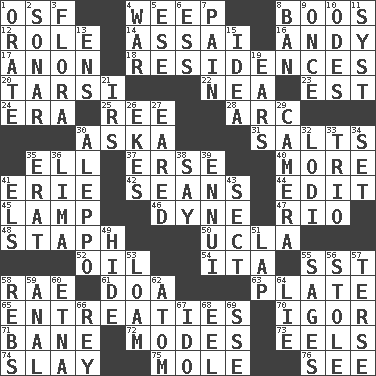 ACROSS 1. Order of Saint Francis (abbr.) 4. Shed a tear 8. Scornful sounds 12. Hero or heavy, e.g. 14. Slender Brazilian palm 16. "60 Minutes" Commentator Rooney 17. At once, immediately (arch.) 18. Homes 20. Tarsus (plural) 22. Teachers' org. 23. Eastern Standard Time (abbr.) 24. Epoch 25. To separate or throw off 28. Curve 30. "____ silly question..." 31. Table seasonings 35. Pipe bend 37. Celtic language 40. Greater amount 41. 4th largest of the Great Lakes 42. Actors Connery and Penn 44. Prepare for publication 45. Desk light 46. Centimeter-gram-second unit of force 47. _ de Janeiro 48. Staphylococcus 50. Southern CA. univ. 52. Petroleum 54. Call ___ day 55. Fast jet (abbr.) 58. Actress Charlotte 61. ___ good deed 63. Food holder 65. Pleas 70. Russian composer Stravinsky 71. Object of repulsion 72. Methods 73. Snakelike fish 74. Kill 75. Undercover agent 76. Observe DOWN 1. Speak pompously 2. Echolocation 3. Plants 4. Armed conflict 5. Compass dir. 6. Double-curved letter 7. Ache 8. Forbid 9. Single time 10. Lyric poems 11. System (abbr.) 13. Followers of ems 15. The main thing one is thinking about 19. Hearing organs 21. Big collection agency 26. Supplements with great effort 27. Having ears or earlike features 29. Device for capturing images 30. City in Syria 32. Farming town in central California 33. Musical group of three 34. Arrange properly for use 35. Part of Q.E.F. 36. Pale green bean 38. Declare 39. World-weariness 41. Raised railways 43. Religious group 49. Flintstone garb 51. Pet locale 53. Rich soil 55. Gurus 56. Fur scarf 57. Laconic 58. Confederate soldiers (slang) 59. Of or related to the anus 60. Inactive volcano in Sicily 62. Smallest unit of an element 64. Falsehood 66. Marina Del _, California 67. Wedding promise 68. Snakelike fish 69. Compass dir.