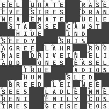 ACROSS 1. Snakelike fish 4. A salt of uric acid 9. To erase 13. Night before a holiday 14. Titles for men of rank and authority 15. Northwest Algerian city 16. Teachers' org. 17. Related on the mother's side 18. Ubangi River tributary 19. R.R. building 21. Compass dir. 22. 2nd pers. sing. pres. of can (arch.) 24. Flintstone garb 26. Working for oneself (abbr.) 27. Sleazy 29. Indian titles of respect 30. Match 31. Cowardly lion portrayer 33. Friend of Pooh 36. Actress Charlotte 37. Popular '50s hangout 40. Connecticut Ivy Leaguer 41. Find the sum of 42. Singles 43. Artist's stand 45. Loyal 47. Goodbye (Sp.) 48. Attila the _ 49. Downhill vehicle 50. A special lineage 52. Flowery wreath 54. Born 56. Perceives with the eye 57. Dipping utensil 59. Compass dir. 61. Painter Guido (1575-1642) 62. Poet Dickinson 63. Music discs 64. Angers 65. Honkers 66. Greek goddess of the dawn DOWN 1. Car or cant ending 2. Nights before holidays 3. Resembling or made to resemble leather 4. Purpose 5. Wash lightly 6. Caspian sea tributary 7. False hair 8. Compass dir. 9. Periods in a boxing match 10. Ancient Greek god of war 11. Table seasoning 12. Compass dir. 20. Assistant 22. High-altitude cloud 23. Cuckoo 25. Colored 27. "Two Mules for Sister ____" 28. Mild oath 29. "______ My Girl" (Turtles hit) 31. Actor's bit 32. "___ Maria" 33. Home 34. Margarine 35. Lubricates 38. Unit of ammunition 39. Anneal 44. Arabian gulf 45. College paper 46. Sorrow 49. Beverly of Met fame 50. Fermented drink made from hops 51. French philosopher Descartes 52. Unable to walk 53. Singer Brickell 55. Inside; within (prefix) 56. Indian title of respect (Mr.) 57. Part of a journey 58. Sight organ 60. Curvy letter