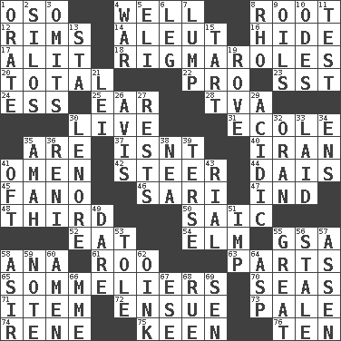 ACROSS 1. Bear (Spanish) 4. Water source 8. Carrot, for example 12. Basketball hoops 14. Eskimo relative 16. Flintstone garb 17. Set down 18. Frustrating wastes of time 20. Add up to 22. Adept person 23. Fast jet (abbr.) 24. Curvy letter 25. Hearing organ 28. Federal power corp. 30. Moving, as bait 31. Learning spot: Fr. 35. "We ___ not amused" (Victoria) 37. Is not 40. SW Asia republic 41. Sign of things to come 42. Bull 44. Raised platform 45. Papal veil 46. Indian skirt 47. Indiana (abbr.) 48. One of three equal parts 50. Ketch in the Levant 52. Consume 54. Shade tree 55. Girls' org. (abbr.) 58. Santa ___, CA 61. Friend of Pooh 63. Actors' quests 65. Wine waiters 70. Oceans 71. A distinct part 72. Follow as a consequence or result 73. Diluted with white 74. French philosopher Descartes 75. Peachy ____! 76. Nine, plus one DOWN 1. Speak pompously 2. Grain storage towers 3. Leaves out 4. Armed conflict 5. Connecticut Ivy Leaguer 6. Part of a journey 7. Mass 8. 17th letter of the Greek alphabet 9. Petroleums 10. Lyric poems 11. Trial 13. R.R. building 15. Small pie 19. Be footloose 21. Flowery wreath 26. Opinion 27. Musical pauses 29. Being or containing an acid 30. Poe poem 32. Northwest Algerian city 33. Put down 34. Followers of ems 35. Housemaid 36. Painter Guido (1575-1642) 38. Teachers' org. 39. Laconic 41. Often (poetically) 43. Monetary unit of Yemen 49. Have the gumption 51. Naughty child 53. Lacquered or enameled metalware 55. Relatively large 56. Having lost freshness 57. NE Netherlands city 58. SW Saudi Arabia district 59. Short letter 60. So be it 62. Pig sound 64. Viper 66. Madame (abbr.) 67. Compass dir. 68. Regret 69. Elected rep.