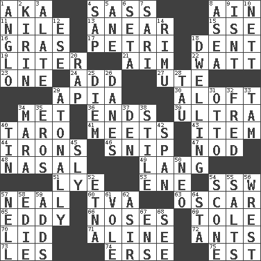 ACROSS 1. Alias (abbr.) 4. Backtalk 8. The 18th letter of the Arabic alphabet 11. Mediterranean tributary 13. Approach 15. Compass dir. 16. Pate de foie ____ 17. _ dish (used to culture cells) 18. Incision 19. 61 cubic inches 21. Direct toward a target or goal 22. Electrical Unit 23. Single 24. Find the sum of 27. Shoshoni 29. Capital of Western Samoa 30. Upward 34. Was introduced to 36. Extremities 39. Extremist 40. Edible starchy tuberous root 41. Confronts 43. A distinct part 44. Metal shackles 46. Clip 47. Dreamland 48. Rhinal 49. Long (Scottish) 51. Potassium hydroxide 53. Compass dir. 54. Compass dir. 57. Be tempered by heat 60. Federal power corp. 63. Witty Wilde 65. Whirlpool 66. Olfactory organs 69. Lacquered or enameled metalware 70. Hat (slang) 71. Place in a line 72. Pismires 73. French article 74. Celtic language 75. Eastern Standard Time (abbr.) DOWN 1. White American of non-Hispanic descent 2. Japanese brewing company 3. Having winglike extensions 4. Plant excrement 5. One (Scot) 6. Bristle 7. Indian skirt 8. Toward the sea 9. Is not 10. Remaining after all deductions 12. Compass dir. 14. Tall New Zealand timber tree 18. Residence 20. Strike 25. South Vietnam president (1954) 26. Natives or inhabitants of Denmark 28. The 19th letter of the Greek alphabet 29. Without tonality 31. Von Bismarck 32. Flintstone 33. Scottish cap 34. Hindu Mythology: god of death 35. Greek god of love 37. Lair 38. Vertical member of a panel or frame 40. Shallow baking pan 42. Connect, as a bridge 45. Insidious 50. Modern: prefix 52. Inactive volcano in Sicily 54. Biscuitlike quick bread 55. Table seasonings 56. Obtain by seizing forcibly or violently 57. 1994 drama film starring Jodie Foster 58. Singer Brickell 59. Sums up 61. Grand slam 62. SW Saudi Arabia district 64. R.R. building 67. Followers of ems 68. Perceive with the eye