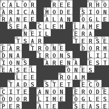 ACROSS 1. Bodily heat indicating an inflammation 6. To separate or throw off 9. 17th letter of the Greek alphabet 12. N. Chile seaport 13. Method 14. The Jewish people; Israel 15. Indian princess (variant) 16. ____ Jay Lerner 17. Stare 18. Ocean 19. To starve (Brit.) 20. Unable to walk 21. Famous astronaut Armstrong 23. Epoch 24. Russian ruler of old 25. Laconic 28. Hearing organ 30. Heavy duty weighing machine 34. Dormintory (informal) 35. Heredity factor (abbr.) 36. Removes the wrinkles 38. Cards in a Roman deck? 39. Charged particles 41. Sports stadium 43. Eastern Standard Time (abbr.) 44. Artist's stand 46. Singles 48. Area sheltered from the wind 49. Wander aimlessly 50. Small amounts or degrees 51. Proofreading order 53. Environmental prefix 56. Quote 57. Soon (poet.) 58. Eat (away) 60. Aroma 61. Welles in "The Third Man" 62. Stares 63. For each 64. Had dinner 65. Gospel singer Marvin DOWN 1. Auto 2. Caspian sea tributary 3. Actor's bit 4. Seas 5. Actress Charlotte 6. Hero or heavy, e.g. 7. Dutch treat 8. Car or cant ending 9. Complicated, petty procedures 10. Hollow 11. Single 13. Promenade 14. Flew 19. High-altitude cloud 20. Allow 22. Erode 24. Interpreter 26. Indian titles of respect 27. Give off 28. Singer Brickell 29. Small Philippine buffalo 31. Mouth or opening 32. Or not 33. Compass dir. 37. Snout, nose 40. Sowing specialist 42. Santa ___, CA 45. French article 47. Develop 49. French philosopher Descartes 50. Event that recurs at intervals 51. In a ____ (agitated or irritated) 52. Heavy book 54. Root beer relative 55. Lyric poems 56. Police officer (slang) 57. Wing 58. Greek goddess of the dawn 59. Compass dir.