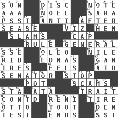 ACROSS 1. Boy, to dad 4. Plate 8. Short letter 12. American Automobile Association (abbr.) 13. Christmas carol 14. "Two Mules for Sister ____" 15. Inconspicuous attention getter 17. Opposed to 18. Following 19. Gospel singer Marvin 21. That is 23. Layer 24. Criticizes harshly 26. Head covering 28. Governing power 30. Commissioned military rank 34. Compass dir. 37. Margarine 39. Mediterranean tributary 40. To free from 41. Ferber et al. 43. Separate the seeds from cotton 44. Angers 46. Snakelike fish 47. Help 48. Elected representative 51. Discontinue 54. Plant holder 55. Fraudulent business schemes 58. R.R. building 61. "One Day ___ Time" 63. Distinguishing feature 65. Continued (abbr.) 67. Painter Guido (1575-1642) 71. Hoop that covers a wheel 72. Von Bismarck 73. A blast of a horn 74. Lair 75. Trial 76. Conclusions 77. Fast jet (abbr.) DOWN 1. Plant excrements 2. Fertile tracts in a desert 3. Rhinal 4. Heredity factor (abbr.) 5. Electrically charged atom 6. Put into a specified state 7. 154 in Roman numerals 8. Science/research agcy. 9. Pledge 10. Woody plant 11. Merit 16. Russian ruler of old 18. Muslim summons to prayer 20. Australian flightless bird 22. Frozen water 25. _ gin 27. Animal enclosure 29. A person who is older than you are 30. Purposes of endeavors 31. Capital of Latvia 32. Mountain range southwest of Kyrgyzstan 33. Grant temporary use of 34. Indian titles of respect 35. Title for a man of rank and authority 36. Paradise 38. Compass dir. 42. Fast planes 45. Plant excrement 49. Frog relative 50. Baseball player Mel 52. Sep. follower 53. Role in a play 56. Women servants 57. Begets 58. Highlander 59. Carryall 60. Pismires 62. Johnson of "Laugh-In" 64. Portable shelter 66. Small child 68. A really long time 69. Allow head to fall sleepily 70. ___ a Wonderful Life