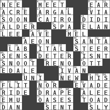 ACROSS 1. Born 4. Rendezvous 8. Hearing organ 11. 43,560 square feet 13. Therefore, facetiously 15. By way of 16. Within a short period 17. Capital of Egypt 18. "You Light Up My Life" star Conn 19. Tree or shrub in the Birch family 21. Health resort 22. Flair 23. Area sheltered from the wind 24. "___ Maria" 27. Cartoonist voice _ Blanc 29. Age 30. Before Barbara or Clara 34. Experiment locale 36. Slanted text style (abbr.) 39. Guide 40. Elected reps. 41. Prevent from occurring 43. Is not 44. Snout, nose 46. Former U.S. Attorney General Janet 47. Baseball player Mel 48. Peak District village in England 49. "Terrible" tsar 51. University (slang) 53. ___ Haven, CT 54. Part of HMS, perhaps 57. Secret move to avoid paying debts 60. And not 63. Elude 65. Travel on or in a vehicle 66. Window treatment 69. Toward shelter 70. Australian flightless bird 71. Fertile tracts in a desert 72. Frog relative 73. One of the 12 tribes of Israel 74. Posted 75. Stealthy DOWN 1. Relating to the nose 2. Learning spot: Fr. 3. Eat (away) 4. Apple computer (short form) 5. Period 6. The front part of a cuirass 7. Canvas cover 8. Morally bad or wrong 9. Opera by Verdi 10. Precipitation 12. Compass dir. 14. Rich soil 18. Conveyance 20. Actress Charlotte 25. Lacking any legal or binding force 26. Keyboard key 28. Curvy letter 29. Utter; complete 31. A home for chicks 32. Portable shelter 33. Nonscientific branch of learning 34. Grant temporary use of 35. Small Philippine buffalo 37. Had dinner 38. Soviet premier 1918-24 40. Compass dir. 42. Be footloose 45. "___ Little Indians" 50. Deep reverence 52. Southeast Asian peninsula 54. Auras 55. Perfect 56. Shabby and untidy 57. Flintstone 58. Pale green bean 59. Goddess of spring and wife of Bragi 61. Mouths or openings 62. Raze (variant) 64. Large container 67. Writing instrument 68. Eastern Standard Time (abbr.)
