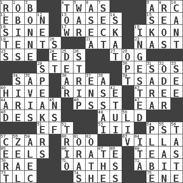 ACROSS 1. Director Reiner 4. It was, poetically 8. Curve 11. Inky black, to poets 13. Fertile tracts in a desert 15. Ocean 16. Trig term 17. Raze 18. Picture 19. Portable shelters 21. _ moment's notice (2 wds.) 22. Political cartoonist Thomas 23. Compass dir. 24. Begley and Asner 27. Coat; cloak 29. Proofreading order 30. Mexican monetary units 34. Plant excrement 36. Length times width 39. Sadhe (variant) 40. Hub of activity 41. Wash lightly 43. Woody plant 44. Believer in; advocate of (suffix) 46. Inconspicuous attention getter 47. Ewer handle 48. Writing tables 49. Old (Scot.) 51. Newt 53. One more than two 54. Pacific Standard Time (abbr.) 57. Russian ruler of old 60. Friend of Pooh 63. Country residence 65. Snakelike fish 66. Feeling or showing extreme anger 69. Beverages made from leaves 70. Actress Charlotte 71. Profane or obscene expressions 72. "This won't hurt ____!" 73. Affectionate concern, for short 74. "______ My Girl" (Turtles hit) 75. Compass dir. DOWN 1. Musical pauses 2. Off-Broadway awards 3. Maid-servant 4. Pull behind 5. Armed conflict 6. At sea 7. Religious group 8. "____ silly question..." 9. Vintage cars 10. Patter 12. Fish or hair follower 14. Three-handed card game 18. Eaten 20. Arrange properly for use 25. Letter starter 26. Remove all contents or possession from 28. Elect 29. Orators 31. "Two Mules for Sister ____" 32. River in Europe 33. Perceive with the eye 34. The founder of a family 35. Opinion 37. Followers of ems 38. Slender Brazilian palm 40. Possessed 42. Needle case 45. Overdraft (abbr.) 50. 54 in ancient Rome 52. Musical group of three 54. Military trainee 55. Killed 56. Clothes sense 57. An absolute certainty 58. Ardor 59. Actor Baldwin 61. Mouths or openings 62. Pledge 64. Call ___ day 67. Definite Article 68. Curvy letter
