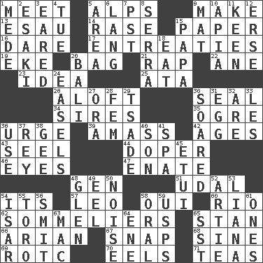 ACROSS 1. Rendezvous 5. High mountains 9. Cause to be 13. He sold his birthright 14. To erase 15. Some stationery 16. Have the gumption 17. Pleas 19. Make supply last 20. Container for groceries 21. Reproach for some lapse or misdeed 22. One (Scot) 23. It may be bright or harebrained 25. _ moment's notice (2 wds.) 26. Upward 30. Lick closed 34. Founders of families 35. Legendary monster 36. Goad 39. Collect or gather 42. Matures 43. Stitch closed the eyes of (a falcon) 44. Drug addict 46. Snake ____ (dice throw) 47. Maternal 48. Commissioned military rank (abbr.) 51. Allodial 54. It is 57. Lion 58. Fr. "Yes" 60. River (Sp.) 62. Wine waiters 65. Comedian Laurel of Laurel & Hardy 66. Believer in; advocate of (suffix) 67. Fastener 68. Trig term 69. College mil. group 70. Snakelike fish 71. Afternoon social gatherings DOWN 1. Ancient Persian 2. 1973 Nobel Price Winner (Physics) Leo 3. Having ears or earlike features 4. Third day of the wk. 5. Type of rug 6. Austrian-born American filmmaker Fritz 7. Pacific Standard Time (abbr.) 8. Father Junipero _ 9. Floor covering 10. Capital of Western Samoa 11. Peachy ____! 12. Celtic language 15. Dad 18. Erode 20. Indonesian resort city 24. Artist's stands 27. Mouth or opening 28. Opposite of masc. 29. Sadhe (variant) 30. Flew 31. Ovum 32. "We ___ not amused" (Victoria) 33. French article 36. Purpose 37. Marina Del _, California 38. Unit of force equal to gravity 40. Manchild 41. Health resort 45. Needle case 48. Small, secluded valley 49. Snakelike fish 50. Annoying sound 52. Nick name for Arthur 53. Climbing, woody, usually tropical vines 54. Austrian river, tributary to the Danube 55. "Corrida" creature 56. Stricken, poetically 58. Taken by mouth 59. United States Postal Service (abbr.) 61. Singles 63. Big _ 64. Compass dir. 65. Fast jet (abbr.)